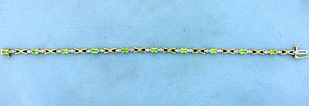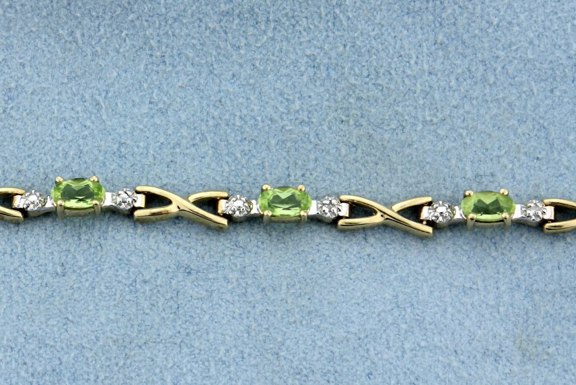 This 10k yellow gold bracelet offers 10 oval gem quality 5mm x 3mm Peridot that have a total weight of 2.50 carats. There are also 10 diamonds that total 0.10 carats. This beautiful bracelet measures 7 3/4" long. 3.6g