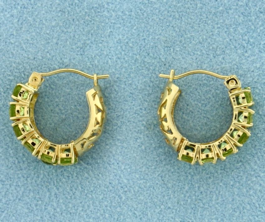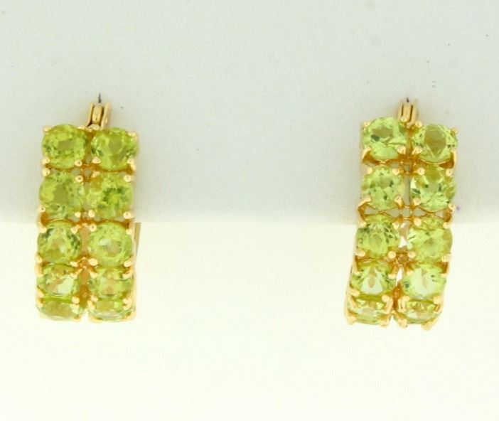 In 14k yellow gold. 1/2" diameter. Each earring contains twelve high quality bright green 3mm round natural peridot gemstones. 3.1g.
