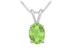 An oval natural peridot is securely held in a luscious 14K white gold prong setting. This gemstone pendant has a total weight (TGW) of 1.00 and comes with a standard 16 14K white gold chain. Available in yellow gold also.