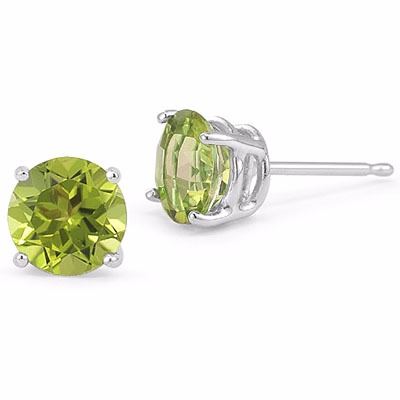 Genuine round cut Peridot gemstones measure 6mm each and are set in Platinum over Sterling Silver stud earring mountings with friction backs. Gorgeous color and clarity! 1.4g