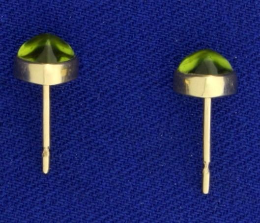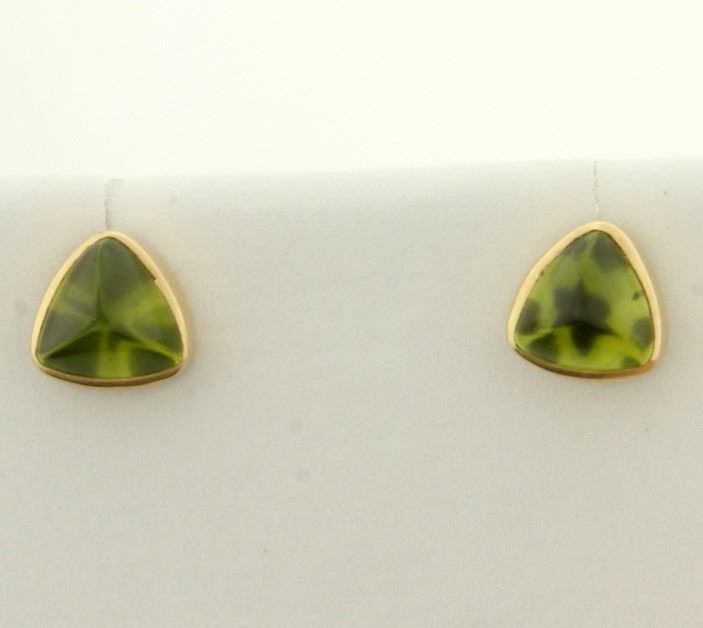 In 14k yellow gold. Each earring contains a natural 5.75mm triangular cabochon shaped peridot gemstone with bright green color and excellent clarity. No backs. 1.3g.