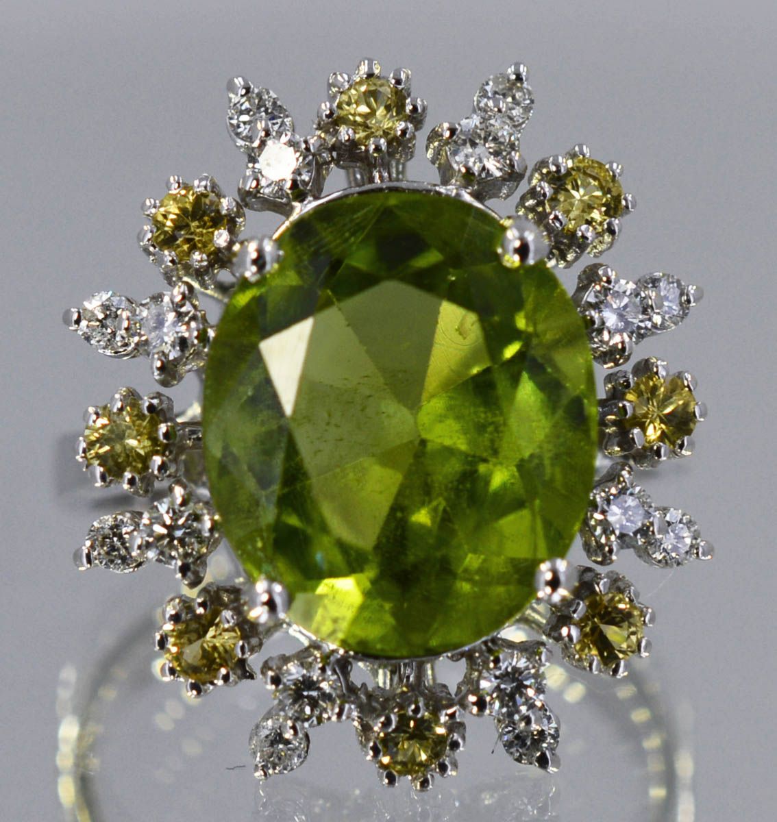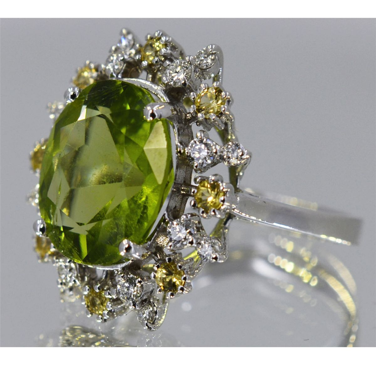 14kt White Gold 4.55 Approx grams including 6.00ct Peridot Oval Excellent cut, .30cttw Ceylon Yellow Sapphire, .30cttw Round Diamond G-H color VS-SI clarity
