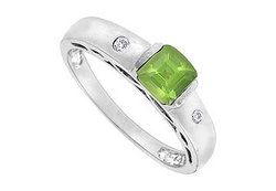 A square olive green peridot is center-set in 14K white gold band. A brilliant-cut diamond is accented on each side. This ring has a total weight (TGW) of 1.00 ct.