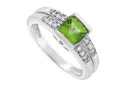 A square grassy green peridot is set in the center & is enlivened by two rows of round diamonds on both sides. Made in 14K white gold this ring has a total gem weight (TGW) of 1.50 ct.