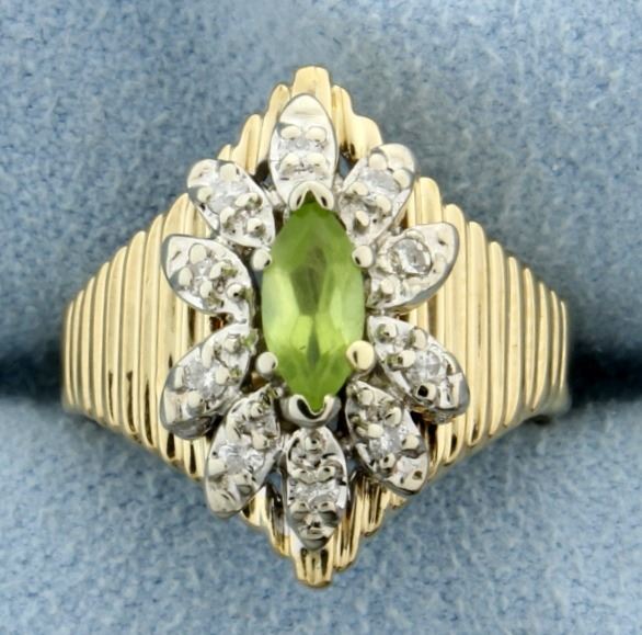 Ring is 14K yellow gold. The Marquis shaped peridot is 7x3.5mm and approx. .5 ct. Diamonds are .1 ct. total weight. Size 4 3/4 6.3g