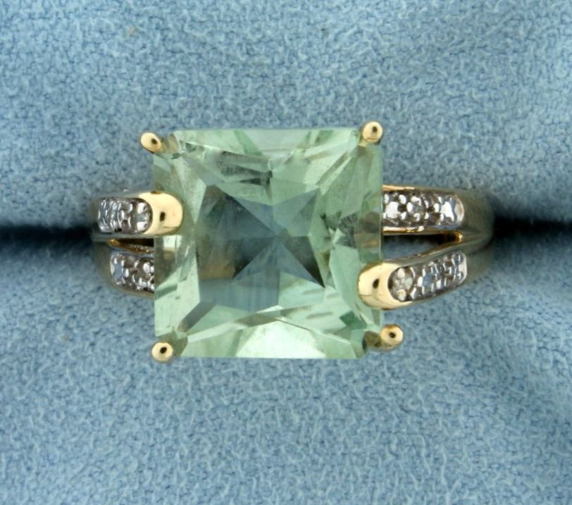 In 10k yellow gold. Contains one natural 10 ct peridot gemstone with pastel green color and excellent clarity. Also contains six high quality .005ct diamonds. Size 8 1/2 with a 2.3mm band. 5.7g.