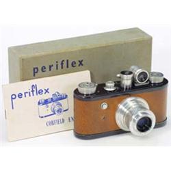 Corfield, England. Erste Ausführung, braune Belederung, mit Anleitung und Originalverpackung. Objektiv Lumar 3,5/50. Serien-Nr. 2.417. Sehr guter Zustand! Lediglich Verschluß bleibt offen. Selten und gesucht! First version in brown leather, with instruction manual and original box. Shutter does not close. Excellent condition. - (2/3-) - € 1.100/1.600 - (62/130)