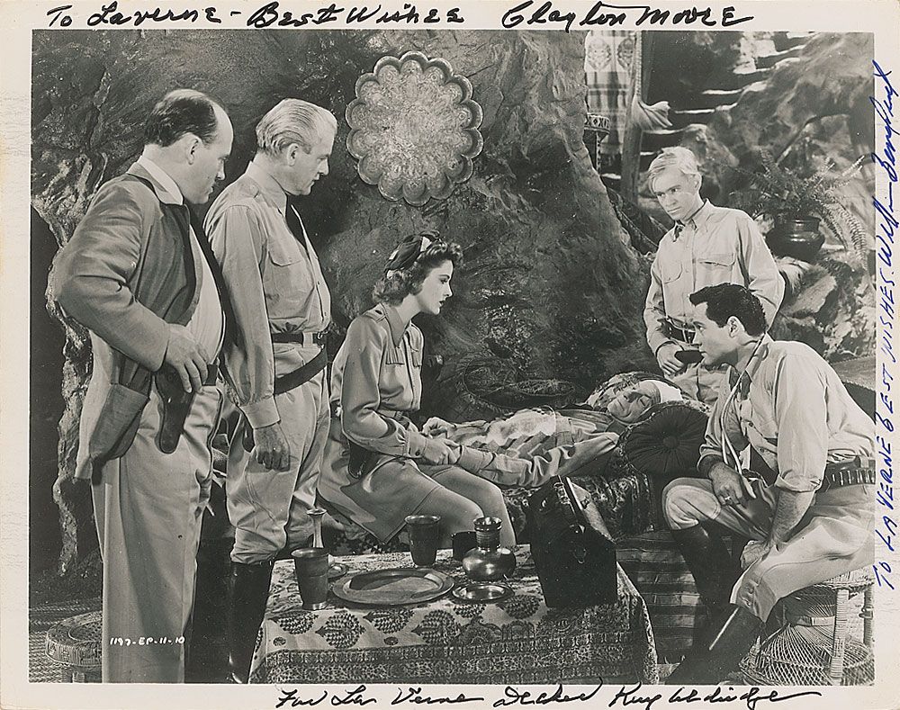 Glossy 10 x 8 photo of a scene from Perils of Nyoka, signed and inscribed in the borders in blue and black ink, “To LaVerne—Best Wishes, Clayton Moore,” “For LaVerne Decker, Kay Aldridge,” and “To LaVerne, Best Wishes, Will Benedict.” In fine condition, light creasing to the upper left, slightly affecting Moore’s inscription.