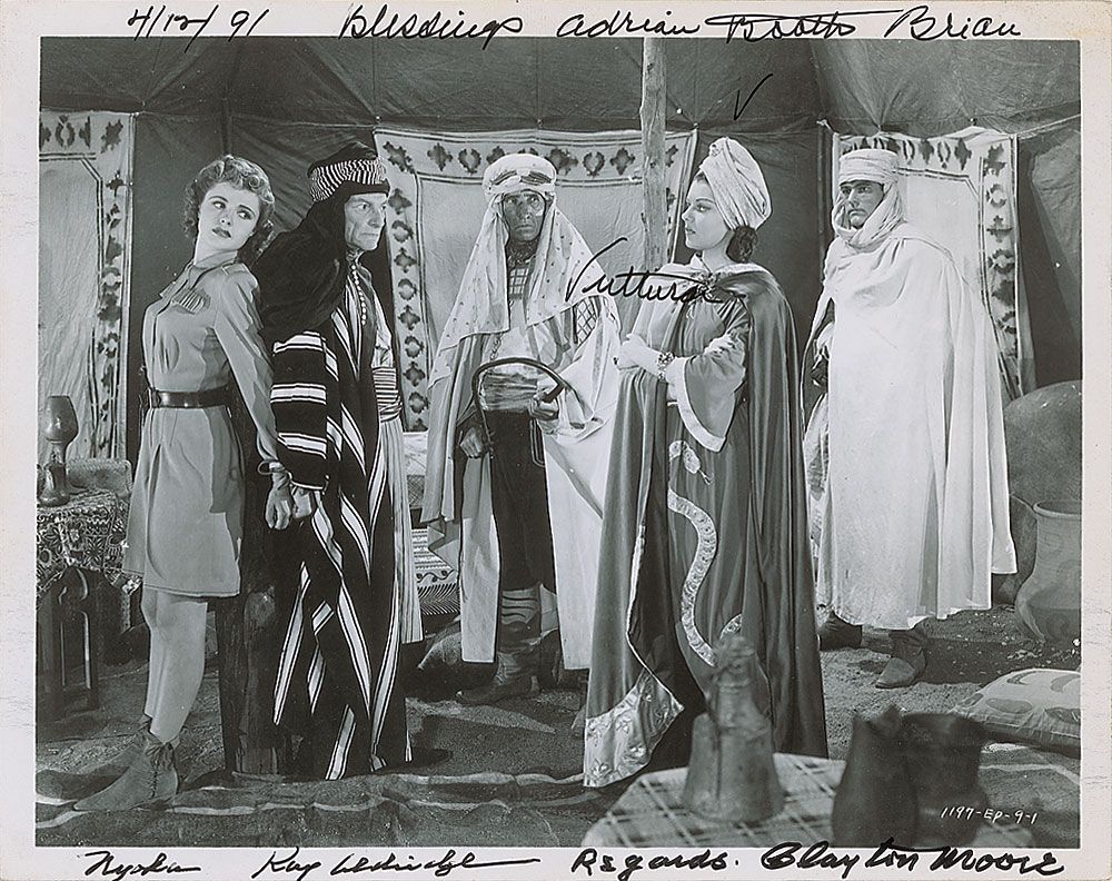 Glossy 10 x 8 photo of a scene from Perils of Nyoka, signed along the borders in black felt tip and ink by Clayton Moore, Kay Aldridge, and Adrian Booth (ins). In fine condition.