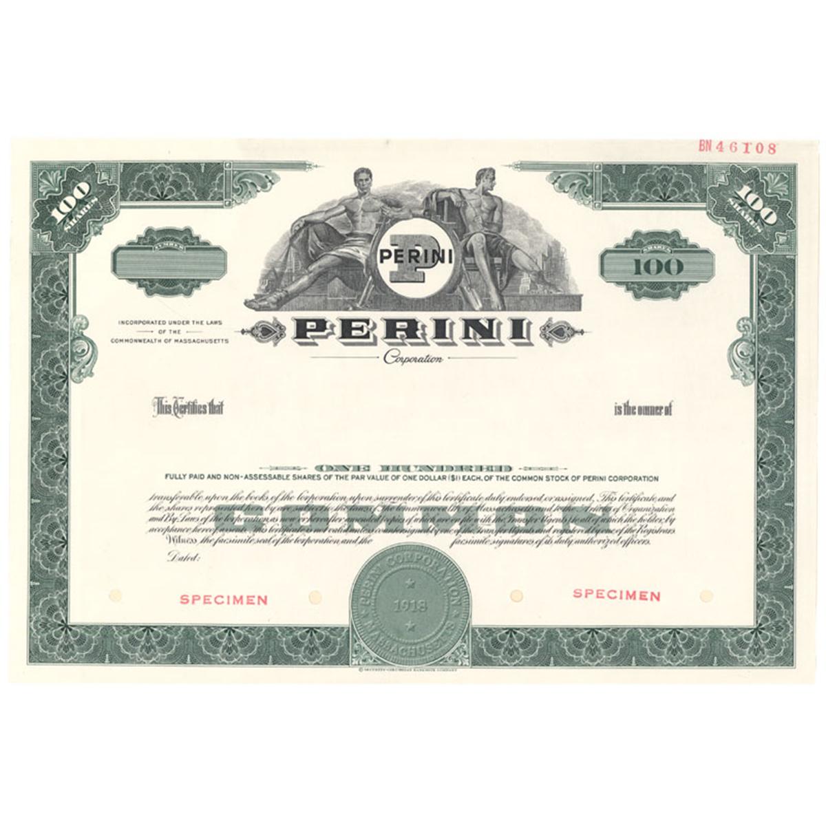 [SPECIMEN] ----, Massachusetts. Stock certificate specimen in Perini Corporation. Green / Black. Vignette of two allegorical males and corporate logo at top center. Stamp and punch cancelled. Very Fine.