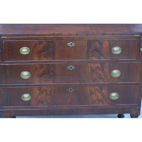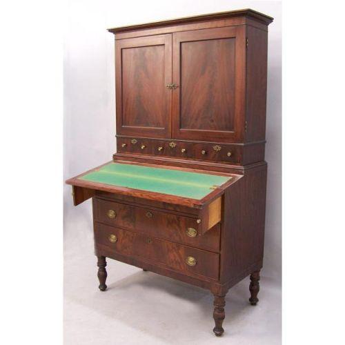 Period American Sheraton drop front mahogany secretary c1825. Two doors over three small drawers over three large drawers. The front drops down to reveal a felt writing surface which is 30 and one half inches at the front. This Antique American Federal Period secretary is 67 and one quarter inches high, 19 and one half inches deep at the base, and 10 and three quarter inches deep at the top. The top has two raised panel doors with book matched matching mahogany and two adjustable interior shelves. Original with old finish.