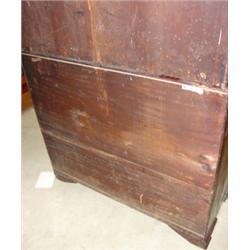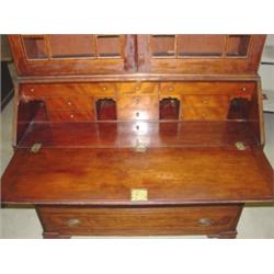 Period Chippendale Secretaire with two lite doors on top, 4 dovetailed drawers on bottom, line inlay, bracket feet. Hardware has been replaced. There is a small 3/4" chip on top right corner of wood. Stands 87 1/2" tall, top measures 45 1/4" wide, and bottom measures 46 1/4" wide. Bottom measures 19 3/4" deep. Slight repair to lid on bottom right corner of hinge on desk.