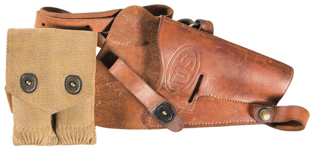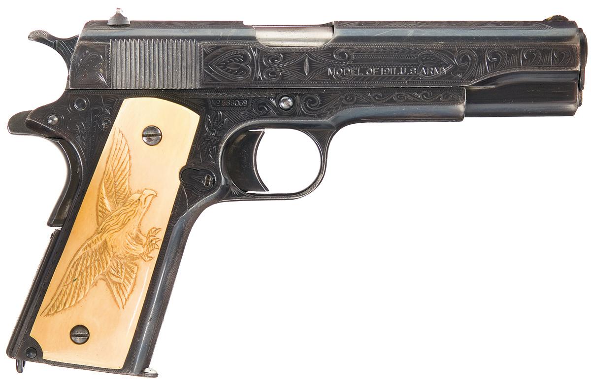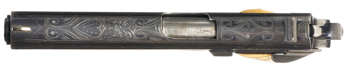 Produced in 1918 on Government contract, and later custom engraved and refurbished. Fixed sights, with gold paint on the front sight, two line, two block address with Rampant Colt on the left and "MODEL OF 1911.U.S.ARMY" on the right. No property or inspector marks remain on the frame, with "No" type serial number marking. Both slide and frame show extensive zig-zag scroll, floral and geometric patterns with textured backgrounds. Equipped with a long trigger, wide hammer with lightly engraved sides, long grip safety, extended thumb safety, Colt barrel, recoil buffer and engraved flat mainspring housing. Grips are attractively aged ivory, with raised carved designs of eagles in flight on each side. With a U.S. Enger-Kress marked brown leather shoulder holster with straps, 2 spare magazines and a May 1918 dated Mills magazine pouch.