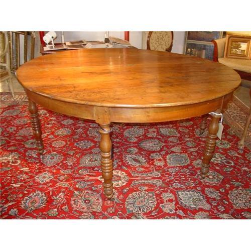 This is a rare, hard to find piece. The table is round, but can be folded over into a demi lune to make room. The top is supported by turned legs on mounted rollers or castors. This versatile piece can be used as a console (folded over), a dining table, or large game table.