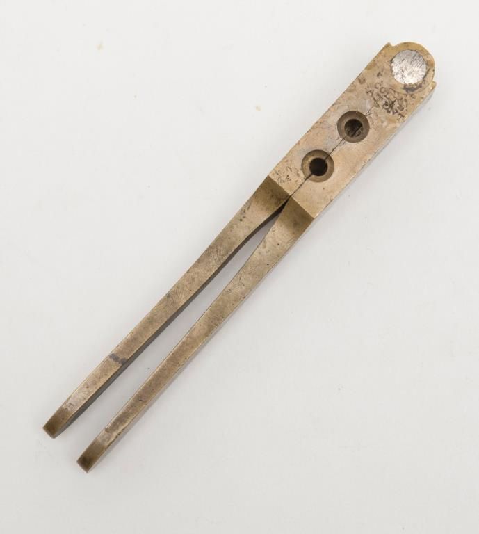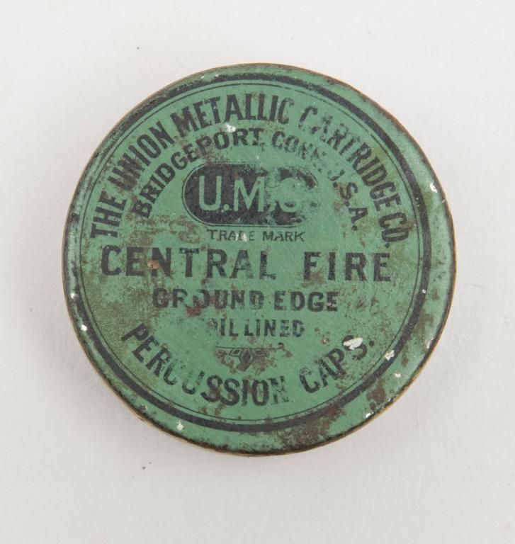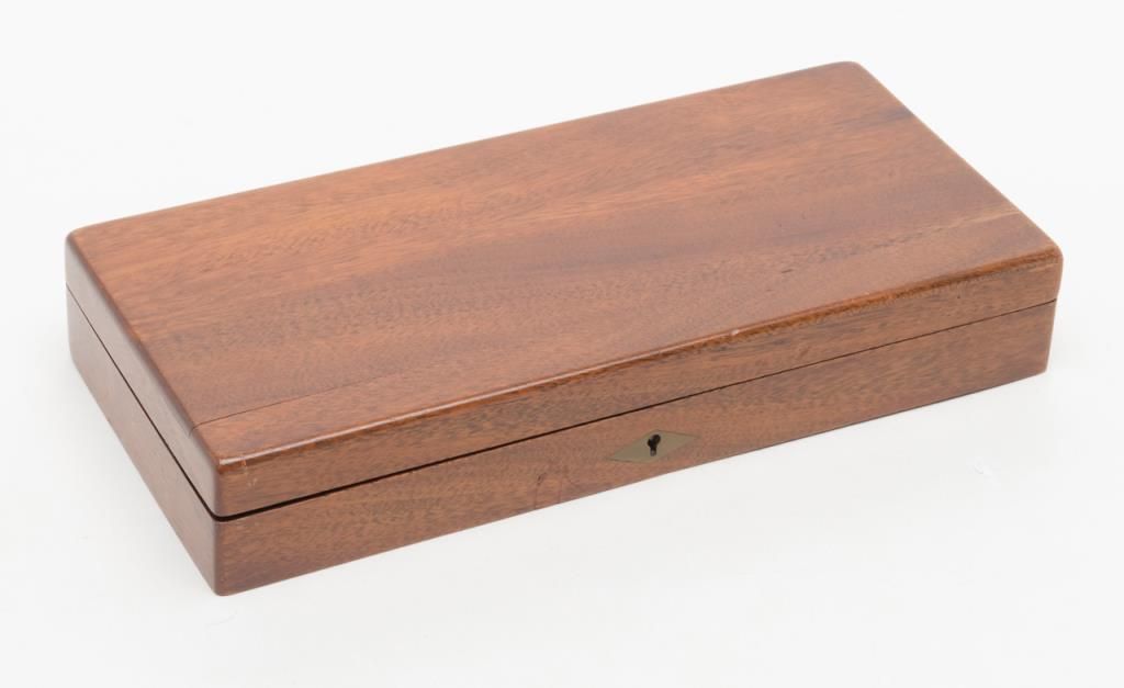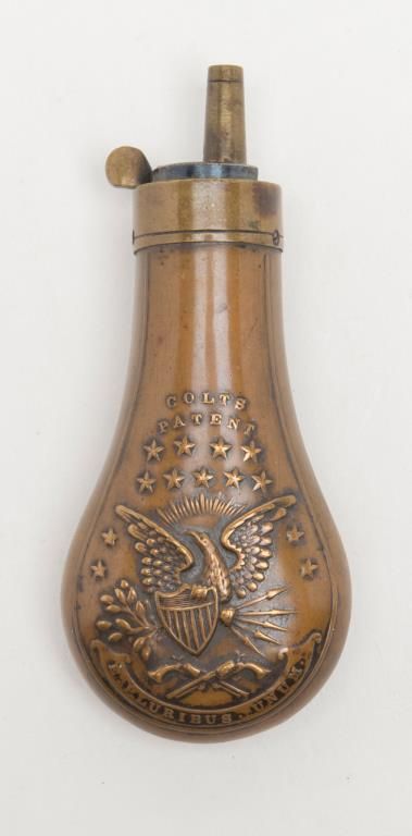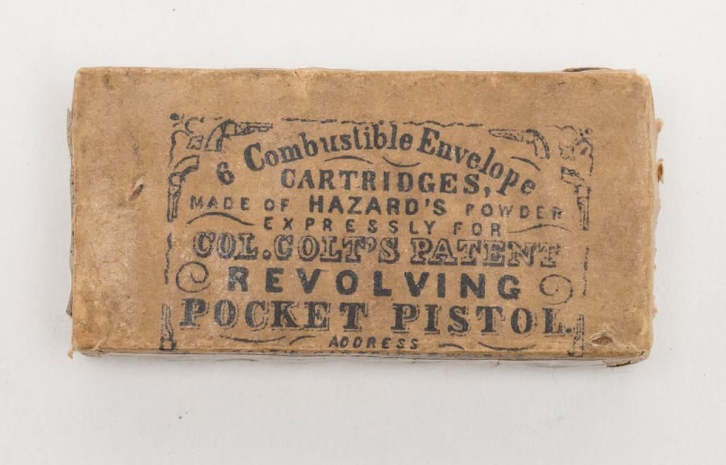 Period Presentation case only (no revolver) for a Colt Model 1849 Pocket percussion revolver with 6” barrel, in overall very good condition with rose colored interior; exterior shows some scattered mars from storage and a crack on the front lefttop side of the lid extending approx. 2”; included are also a Colt’s patent brass two cavity bullet mold, a U.M.C. cap tin with green label, a Colt’s Patent brass powder flask with rich taffy colored patina and a skin pack Envelope of 6 CombustibleCartridges by Harzard for “Revolving Pocket Pistol”. A really nice casing that would go great with a sharp ’49 Pocket Model. Est.: $1,500-$3,000.