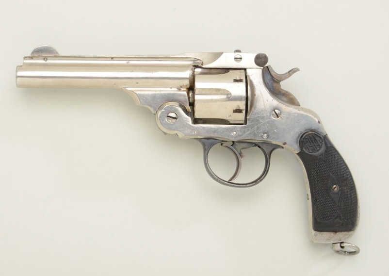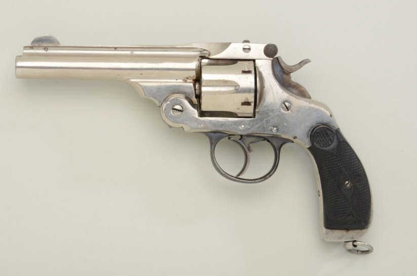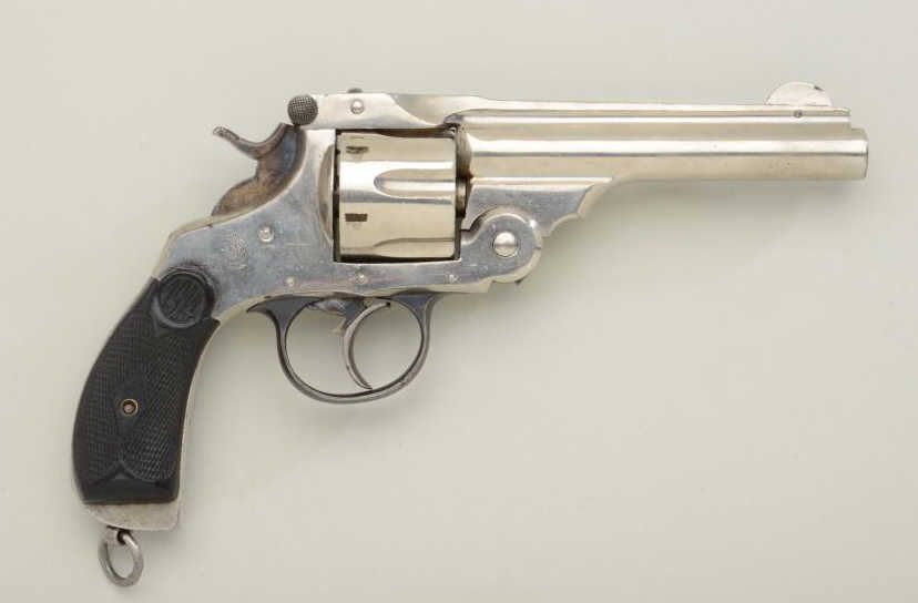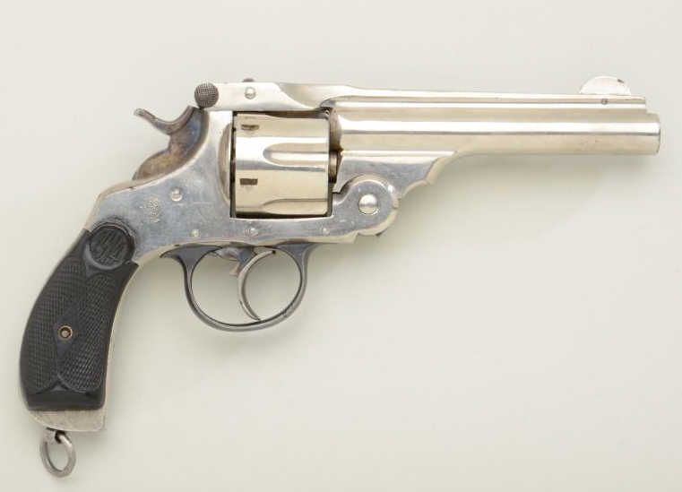 Period copy of Smith & Wesson DA frontier revolver, by Orbea Hermanos of Eibar, Spain, marked Model 1916 on barrel, 10.35mm, nickel plated, hard rubber grips showing 1914 on top of each grip, probably made for export toMexico during the Pancho Villa era. The revolver shows 90-95% original nickel, some minor scratching, just beginning normal age. The trigger guard shows 50% blue, the hammer and trigger show 75% case hardening. Thebore is excellent, the action is working but trigger not returning and the ejector is sticking. The grips are good. Est.: $250-$500