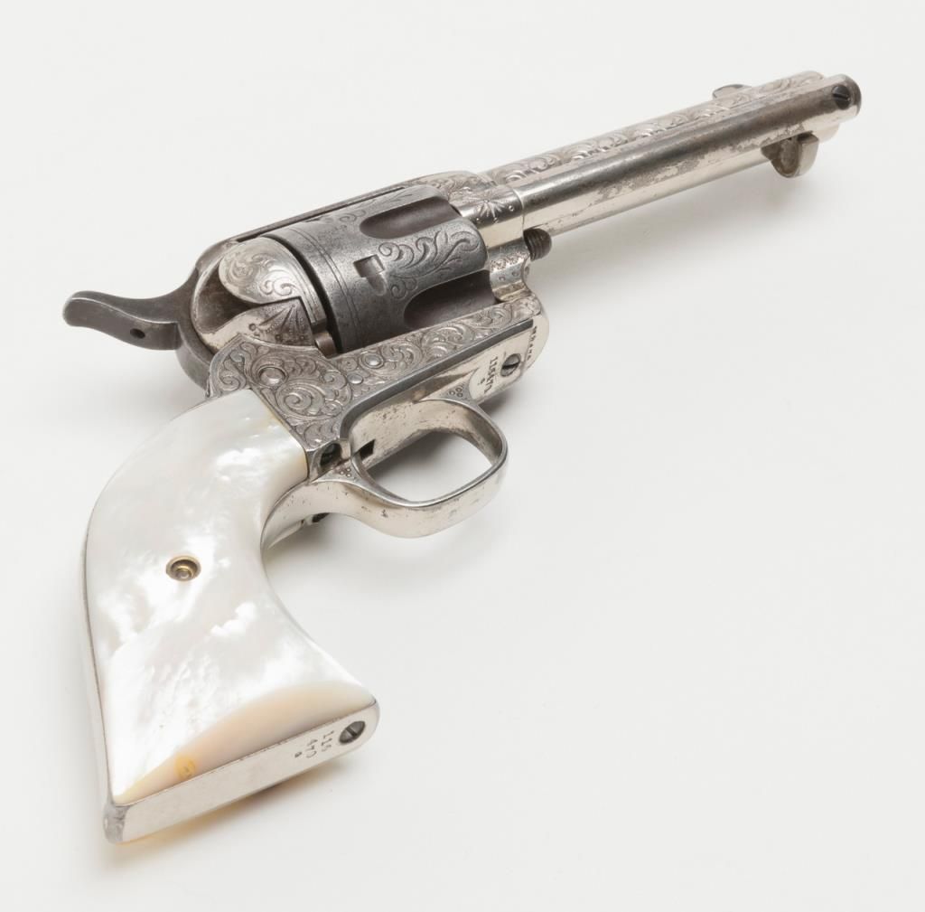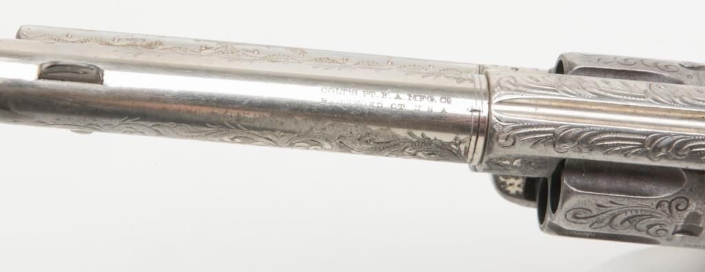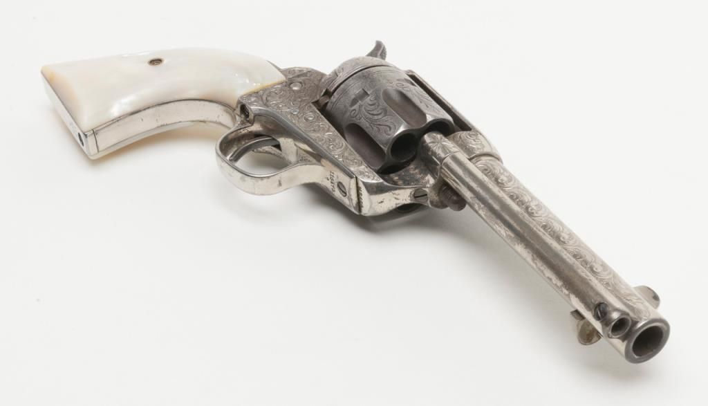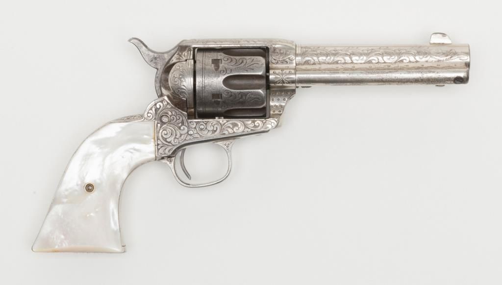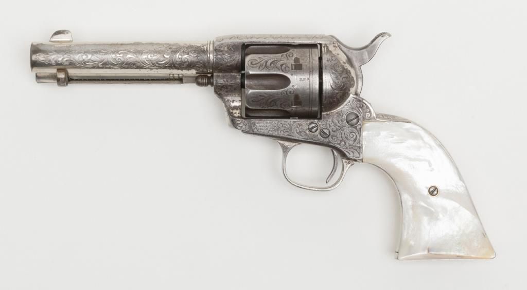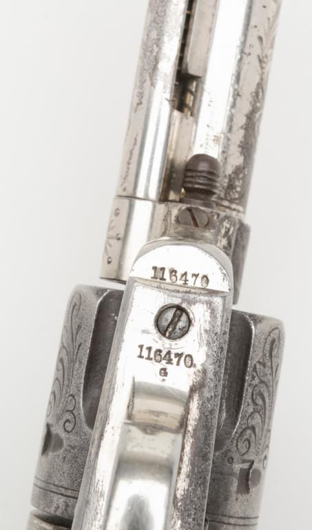 Period engraved Colt Civilian Model SAA revolver, .45 cal., 4-3/4” barrel, nickel finish, pearl grips, #116470 in overall very good condition showing approx. 30% nickel remaining with balance gone to a dark patina with erosion at firingareas, matching numbers on frame, trigger guard and backstrap, no numbers visible on cylinder but “D.F.C.” inspected, “G” inspection marking under numbers on trigger guard and backstrap; no number on the barrel; fair to good bore, crisp action,beautiful iridescent pearl grips in very good to fine condition. From the estate of Joe Kiser. (Antique). Est.: $10,000-$20,000.