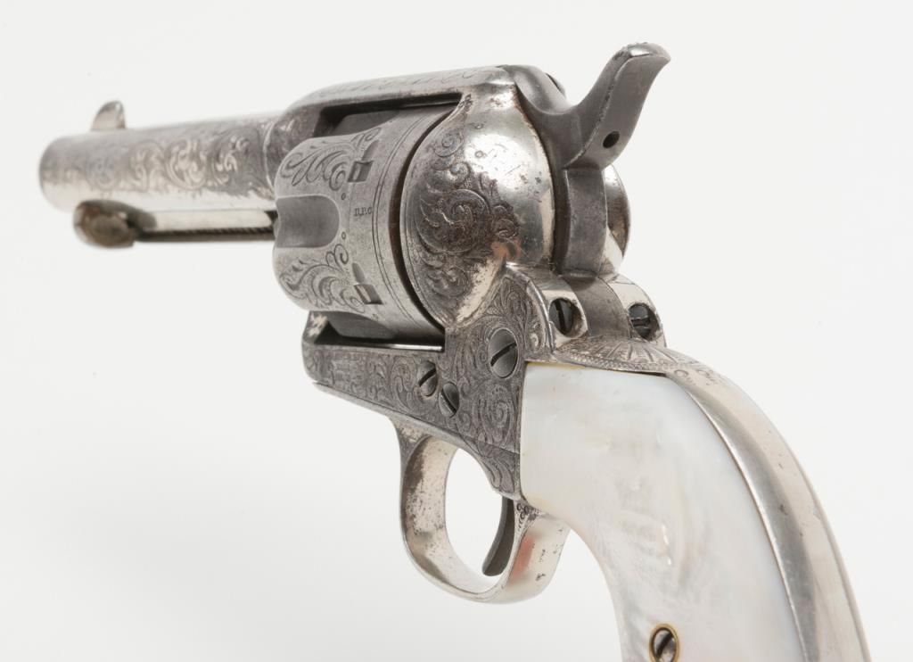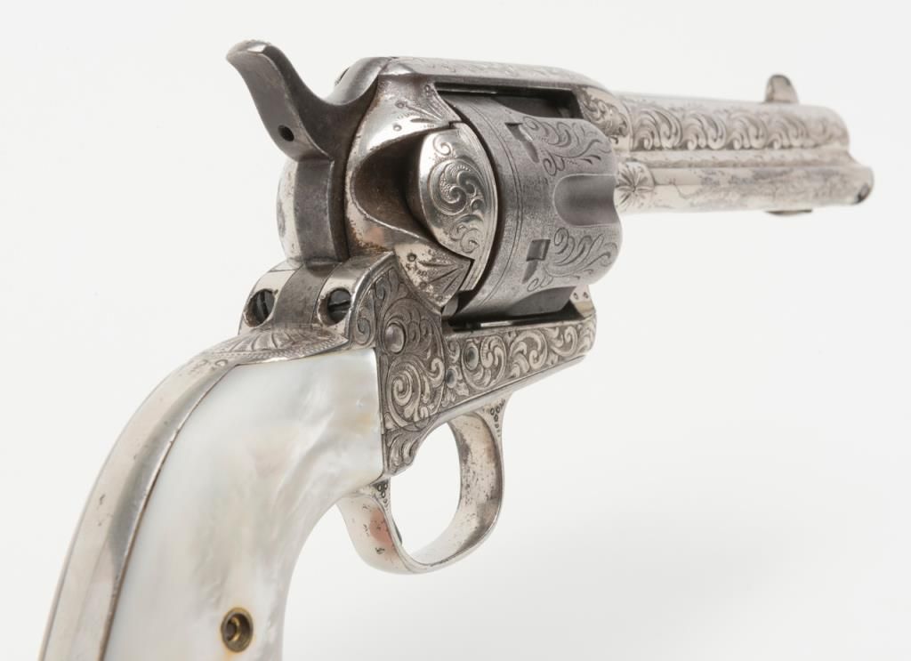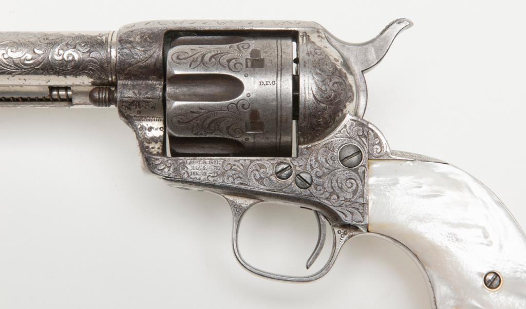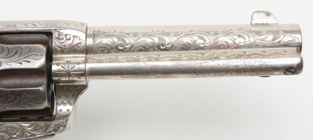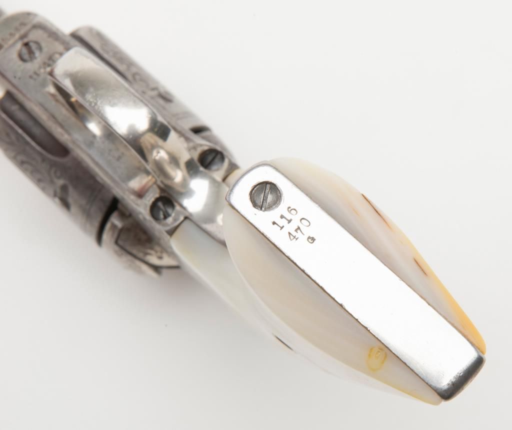 Period engraved Colt Civilian Model SAA revolver, .45 cal., 4-3/4” barrel, nickel finish, pearl grips, #116470 in overall very good condition showing approx. 30% nickel remaining with balance gone to a dark patina with erosion at firingareas, matching numbers on frame, trigger guard and backstrap, no numbers visible on cylinder but “D.F.C.” inspected, “G” inspection marking under numbers on trigger guard and backstrap; no number on the barrel; fair to good bore, crisp action,beautiful iridescent pearl grips in very good to fine condition. From the estate of Joe Kiser. (Antique). Est.: $10,000-$20,000.