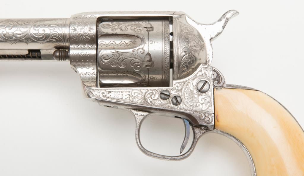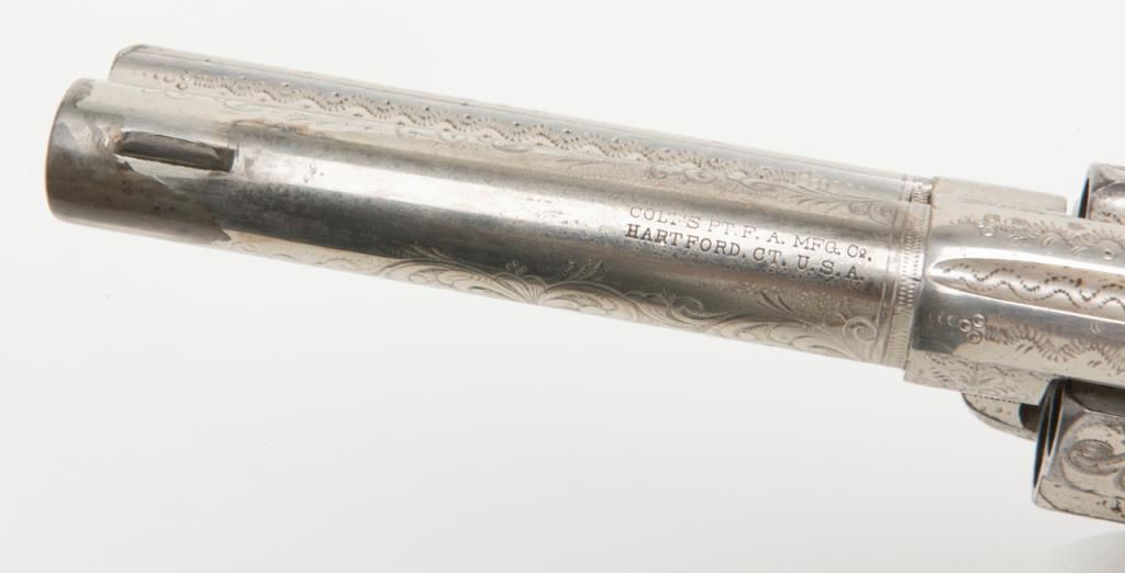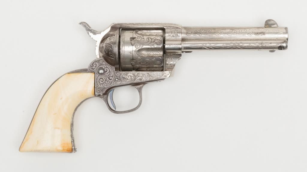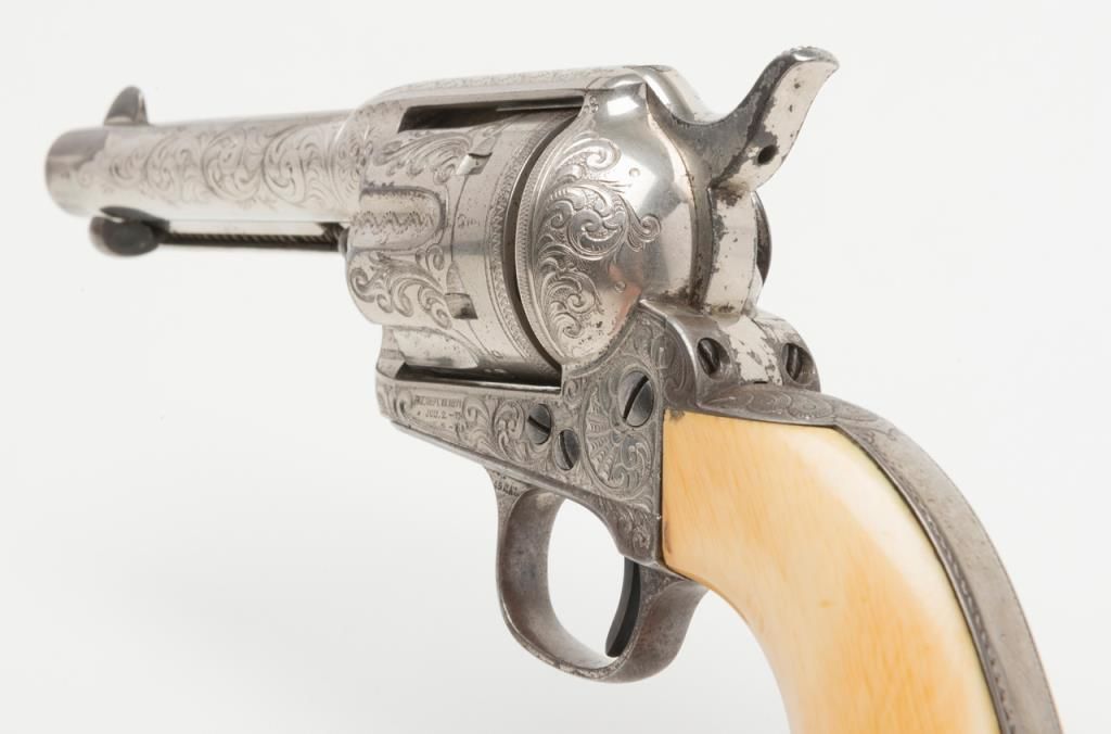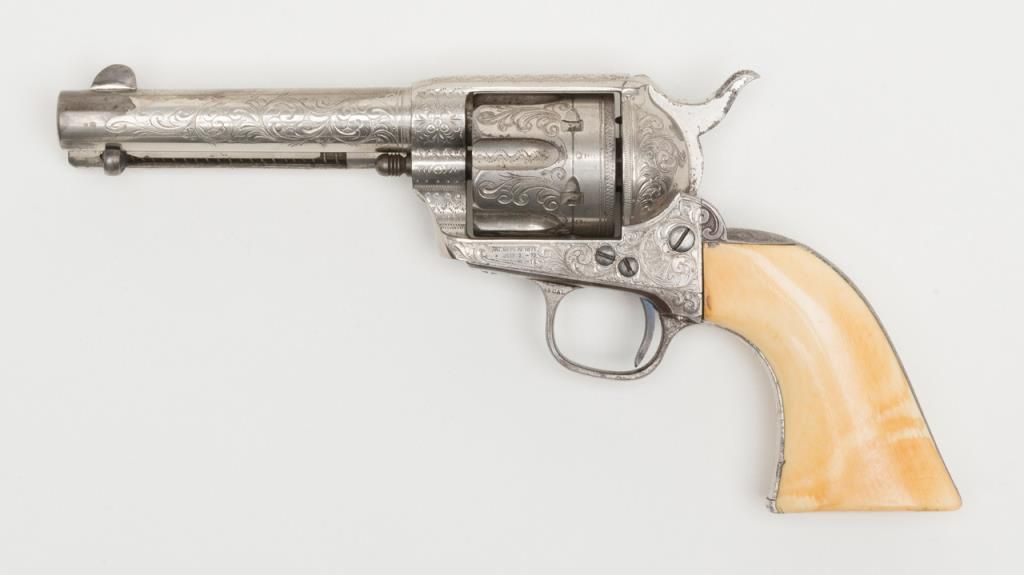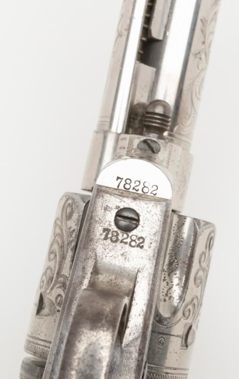Period engraved Colt Civilian Model SAA revolver, .45 cal., 4-3/4” barrel, nickel finish, period ivory grips, #78282, accompanied by factory letter confirming caliber and barrel length, indicating shipped “Soft” (meaning without final finishingfor engraving outside the factory), stocks “Not Listed”, shipped to Schoverling, Daly & Gales, New York, NY on March 15, 1882, 3 guns in shipment. This gun is in overall very good + condition showing considerable nickel finish remaining,crisp action, very good bore, matching visible numbers, finely accomplished engraving, beautiful mellow ivory grips with age cracking in butt area; a great example of a New York style engraved SAA done in the early 1880’s. From the estate of JoeKiser. (Antique). Est.: $10,000-$20,000.