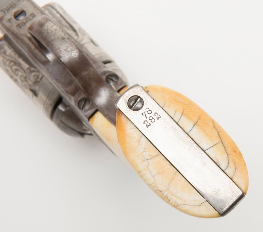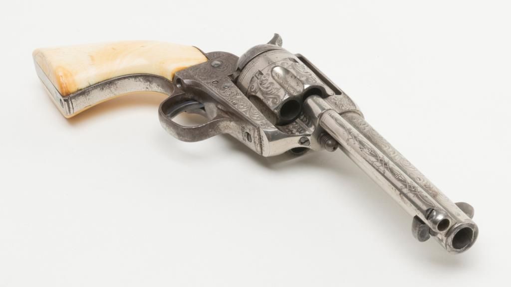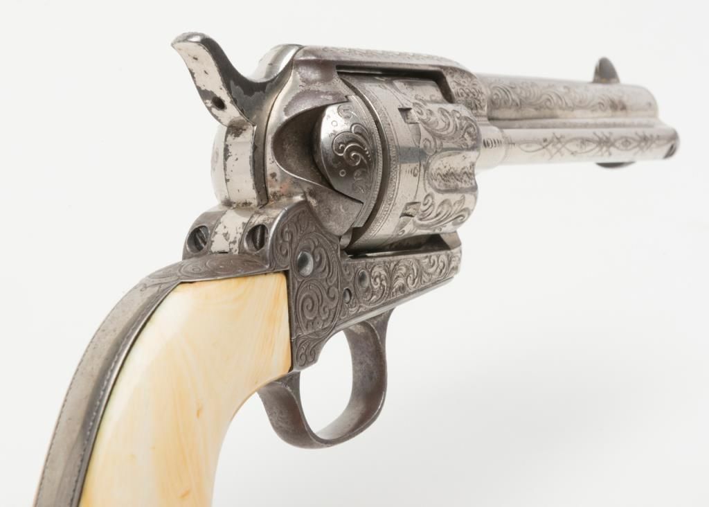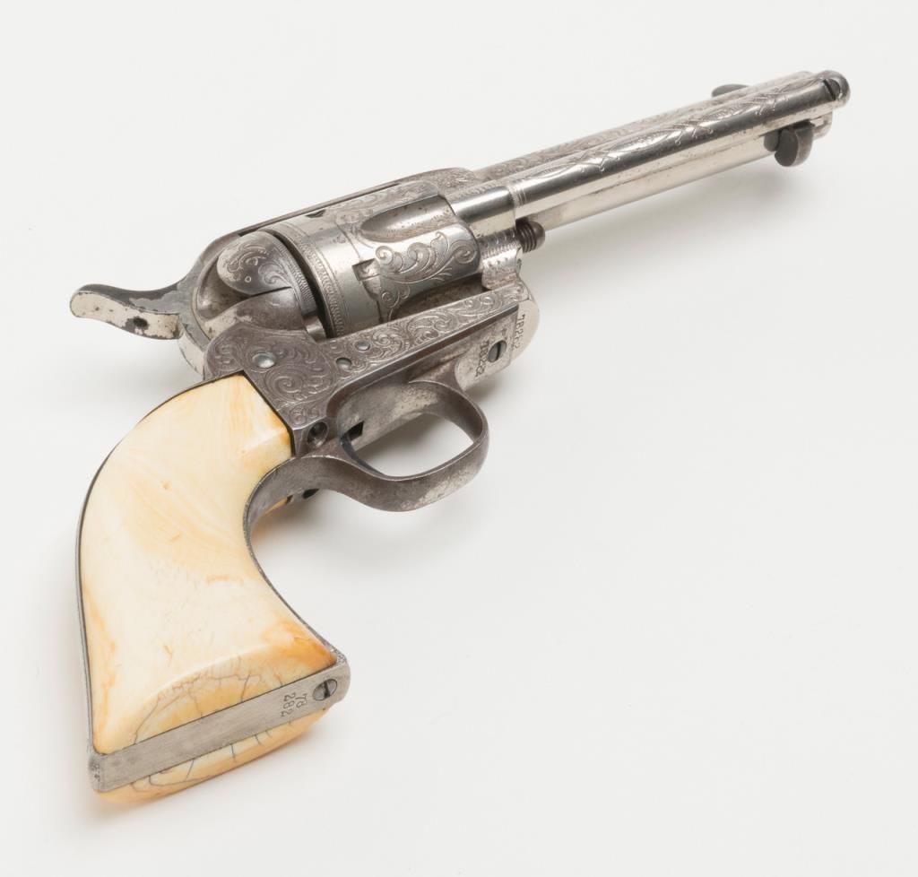 Period engraved Colt Civilian Model SAA revolver, .45 cal., 4-3/4” barrel, nickel finish, period ivory grips, #78282, accompanied by factory letter confirming caliber and barrel length, indicating shipped “Soft” (meaning without final finishingfor engraving outside the factory), stocks “Not Listed”, shipped to Schoverling, Daly & Gales, New York, NY on March 15, 1882, 3 guns in shipment. This gun is in overall very good + condition showing considerable nickel finish remaining,crisp action, very good bore, matching visible numbers, finely accomplished engraving, beautiful mellow ivory grips with age cracking in butt area; a great example of a New York style engraved SAA done in the early 1880’s. From the estate of JoeKiser. (Antique). Est.: $10,000-$20,000.