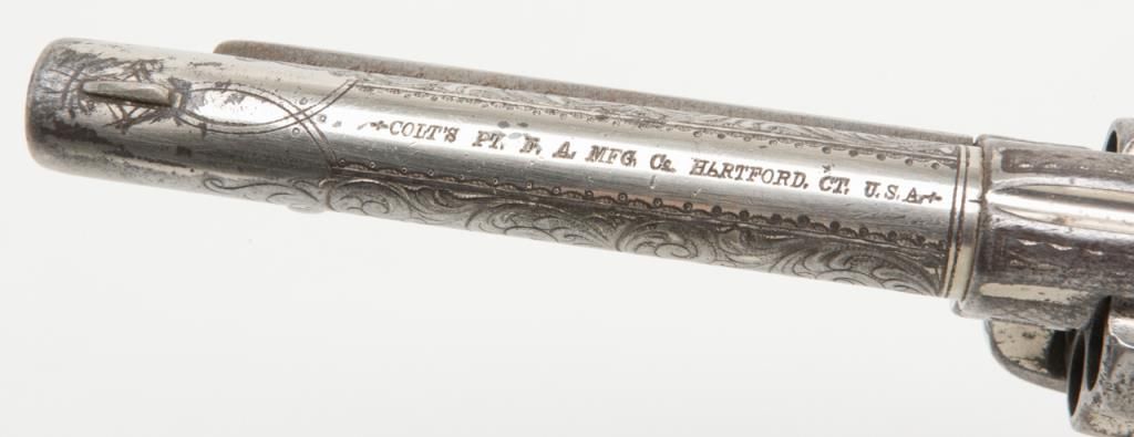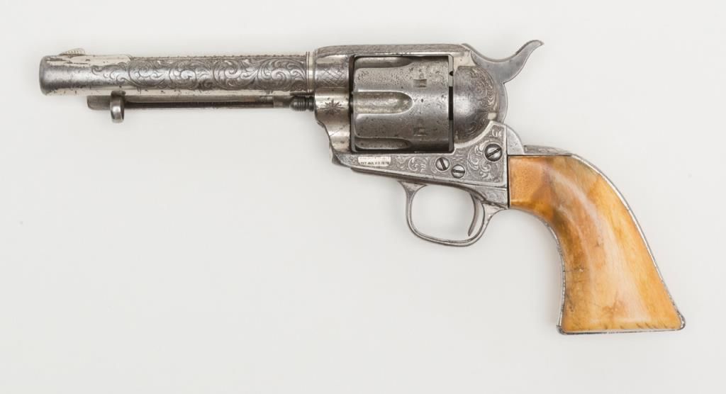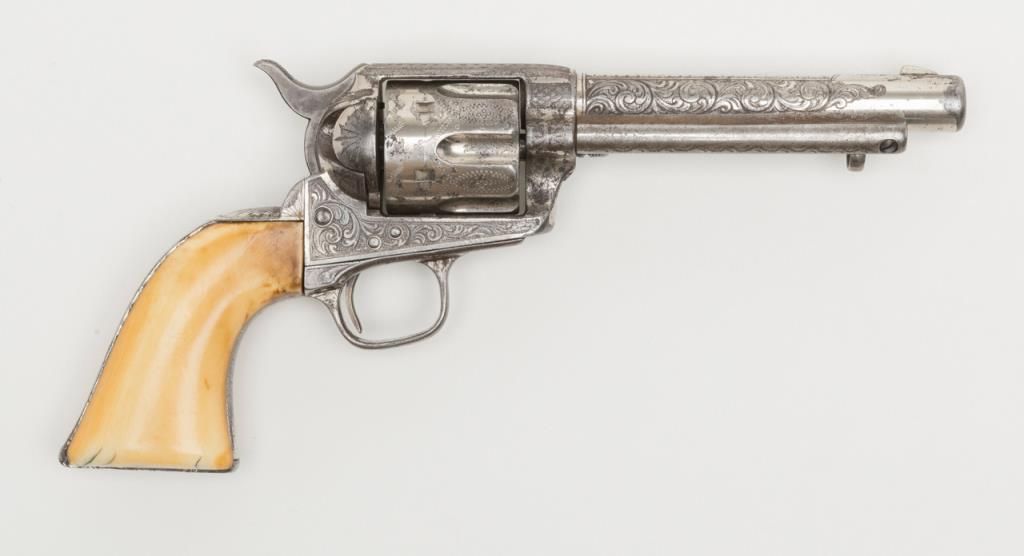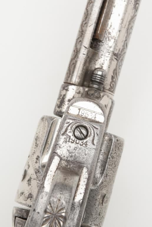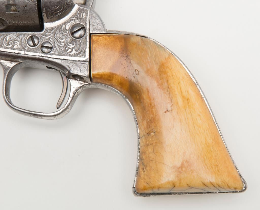 Period engraved Colt Civilian Model SAA revolver, .45 cal., period shortened barrel to 5-3/8”, nickel finish, period ivory grips, #19534 in overall very good condition showing New York style engraving, approx. 30% period nickel finish, fair to good bore, good action and markings, good grips; all matching visible numbers including barrel (#9534). From the estate of Joe Kiser. (Antique). Est.: $7,500-$15,000.
