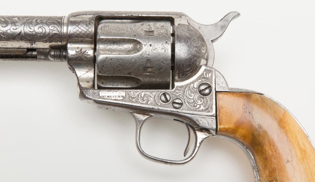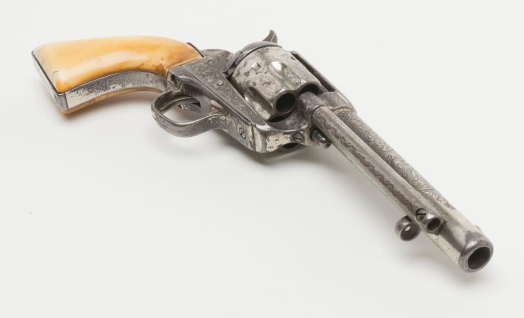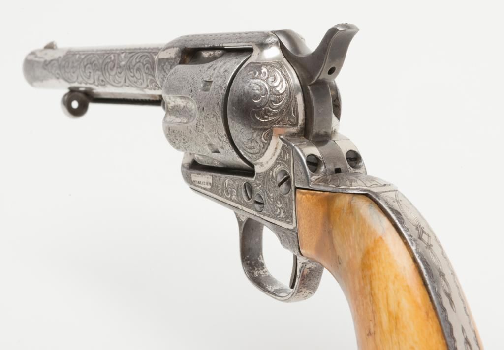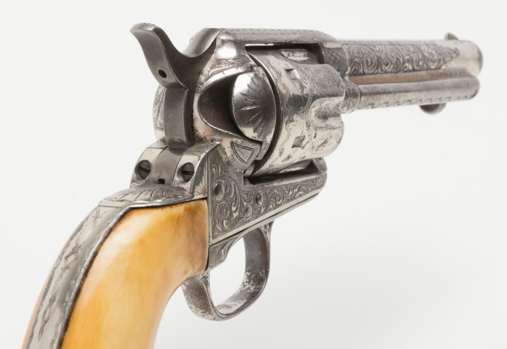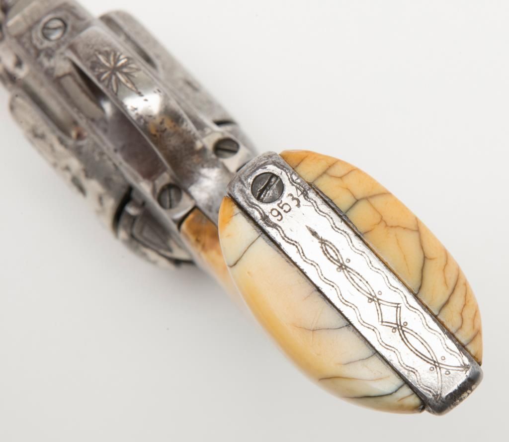 Period engraved Colt Civilian Model SAA revolver, .45 cal., period shortened barrel to 5-3/8”, nickel finish, period ivory grips, #19534 in overall very good condition showing New York style engraving, approx. 30% period nickel finish, fair to good bore, good action and markings, good grips; all matching visible numbers including barrel (#9534). From the estate of Joe Kiser. (Antique). Est.: $7,500-$15,000.