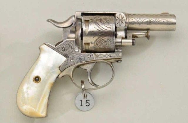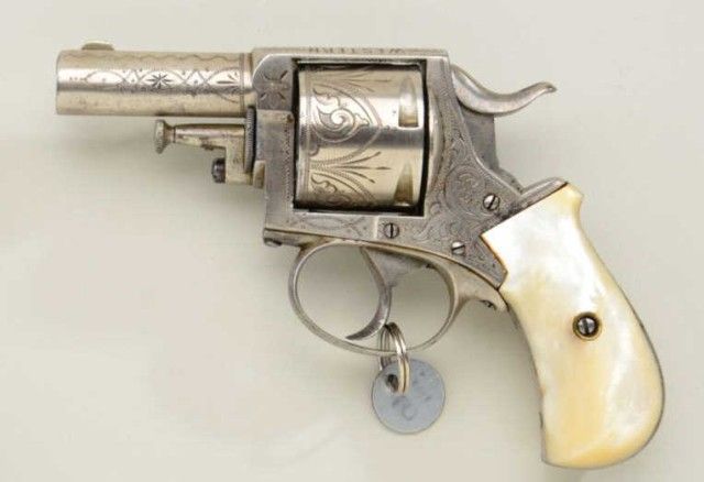 Period engraved DA revolver marked “WESTERN BULL-DOG” on the top strap, .44 cal., 2-3/8” barrel, nickel finish, pearl grips, #NVSN. This gun is in overall very good + condition showing approx. 70% original finish, tasteful engraving, very good bore and action; beautiful thick iridescent period pearl grips; Belgian proofed. Est.: $600-$1,200.