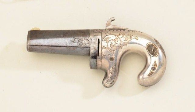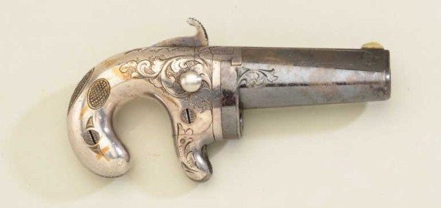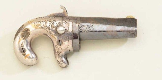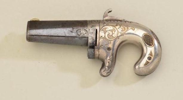 Period engraved Moore’s Patent No. 1 derringer, .38 cal., 2-1/2” barrel, blue finish to barrel and silver wash to brass frame, #967. This gun is in overall very good to fine condition showing approx. 45%original blue on barrel with majority of silver to frame, classic scroll engraving with engraved arrows on each side of the barrel pointing forward, near fine bore, crisp action, sharp markings, finely madereplaced barrel release button; a really nice example of this derringer. Est.: $800-$1,600.