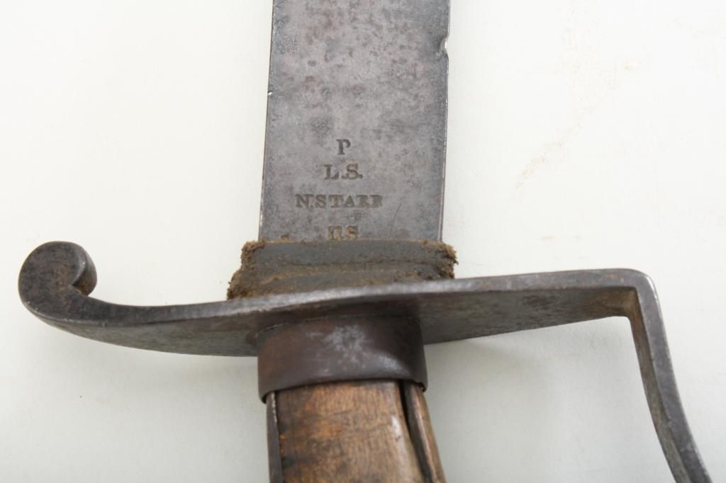 Period-reduced U.S. Starr Model 1813 sword approx. 24” overall with an approx. 19” blade in uncleaned overall very good condition showing a heavy brown patina on metal surfaces with right side of hilt marked“U.S., P, L.S., N. Starr”; D style guard with grooved wood grip. The Confederacy captured and used any weapons they could obtain and this one sure has that “Southern” look. From the Dr. Sterling Fenn collection. Est.:$600-$1,200.