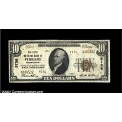 Perkasie, PA - $10 1929 Ty. 2 The First NB Ch. # 5736First Type 2 we've had from this tougher Bucks County bank. Fine-Very Fine. Important notice: We expect to be auctioning lots at the rate of 200-250 per hour. Sometimes eBay Premier live bid software cannot keep up with that pace, so we strongly recommend that you place a realistic proxy bid now as insurance to avoid disappointment. Also please note that all Heritage/CAA lots purchased through eBay Premier carry a 20% Buyer's Premium. Please make sure you read the Terms and Conditions.