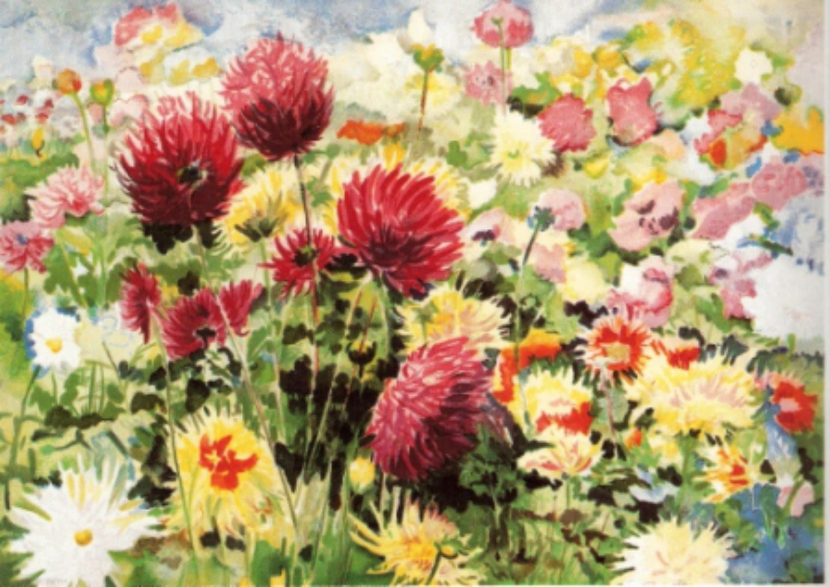 Artist: Perla Fox. Medium: Original Serigraph. Title: Dahlias. Size (Unframed): 18" x 25". Certificate of Authenticity: From the publisher.