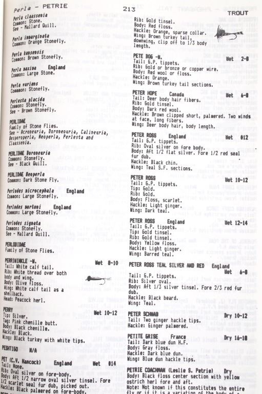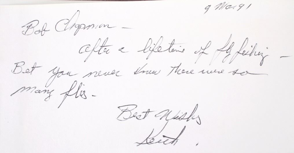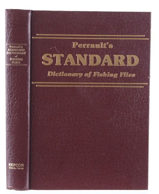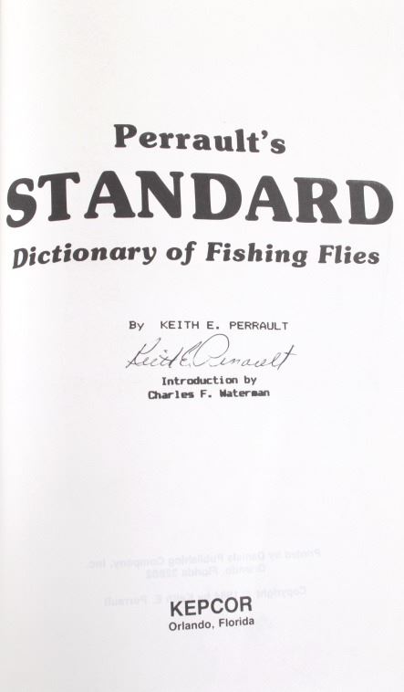 Featured is a signed classic "Perrault's Standard Dictionary of Fishing Flies", by Keith E. Perrault, with separate dedication from the author. Contains appendices on fishing organizations, fly tiers, bibliography plus a glossary of fly tying terms. There's a lot flies listed herein - some 16,000. Flies for every fish that swims - saltwater, freshwater, waters north and south and east and west and lakes and streams; streamers, dries, nymphs, wets, trout, steelhead and salmon. It is interesting to look over the course of several centuries and the explosion of fly patterns. The fly patterns come from around the world such as England, Scotland, Ireland, Canada, Denmark, Africa, New Zealand, Australia, India, Argentina, and Norway, as well as from parts of the world with their own isolated fly fishing colonies, unknown to most fishermen but often made up of master anglers.