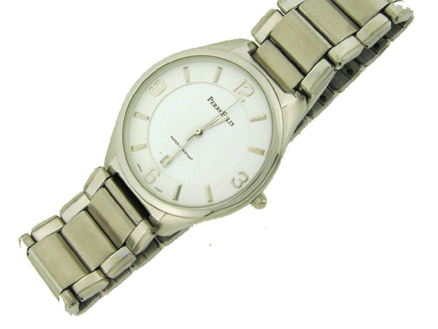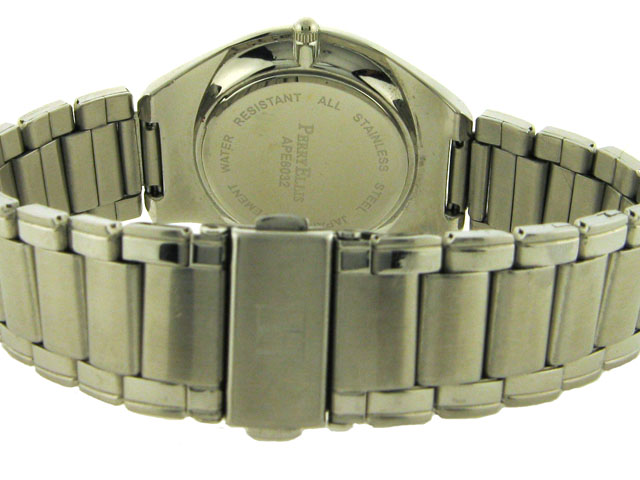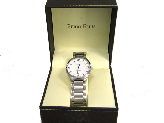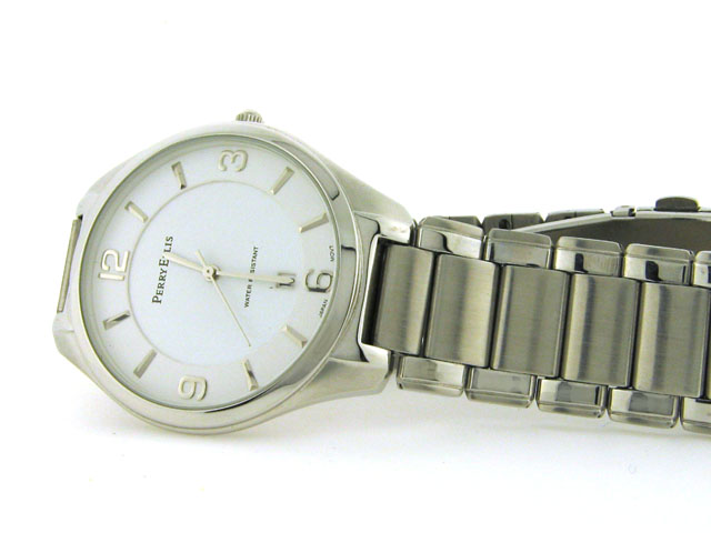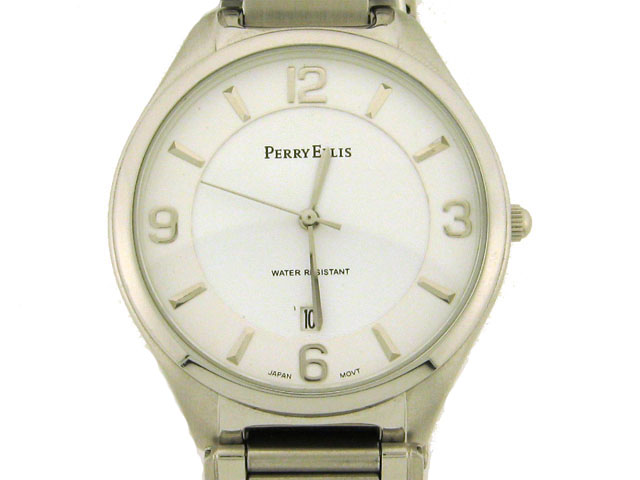 This is a Perry Ellis Dress Watch for Men with the following features: Stainless steel case and band; white dial; Mineral crystal; Japanese movement; date at 6:00; and water resistant.