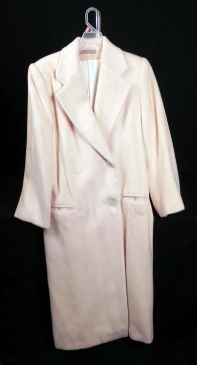 This is a long ladies designer coat by Perry Ellis. The color is cream, and the style is classic and elegant. It is also quite warm, in pure wool. Condition: ExcellentComposition: All wool, with nylon lining Size: 10