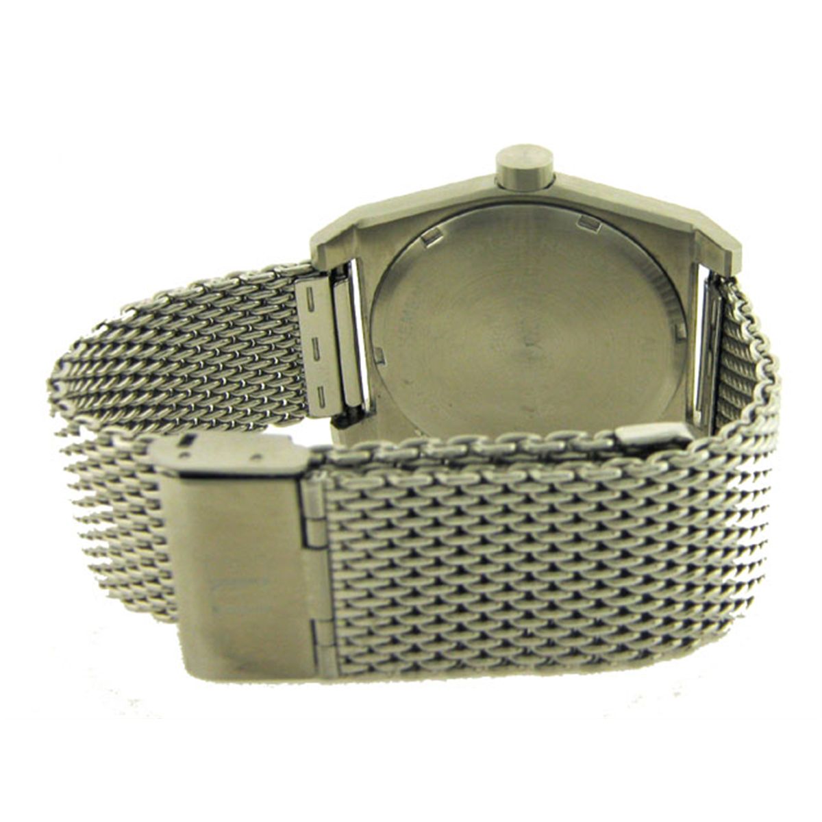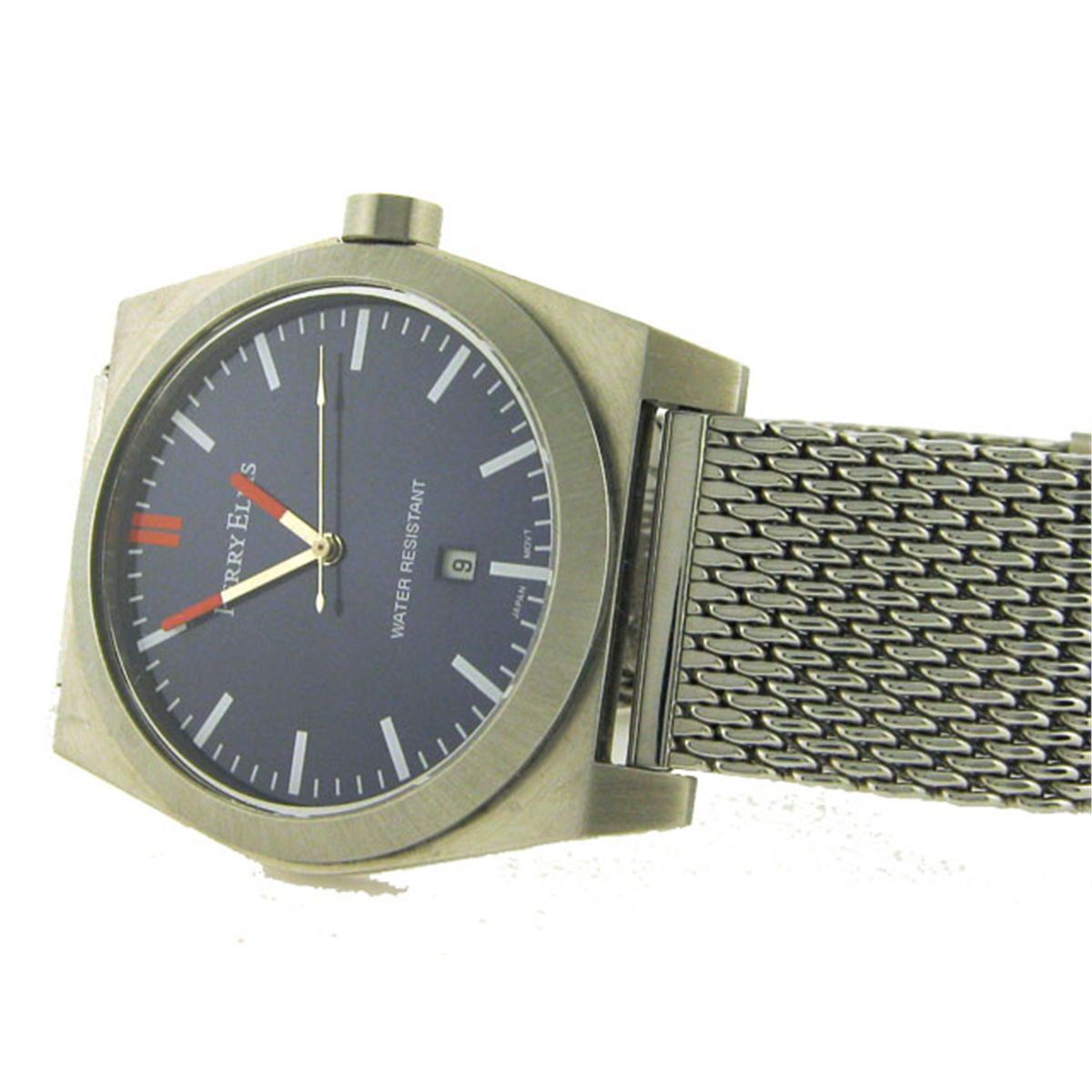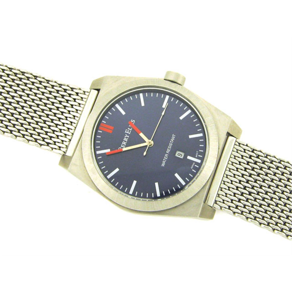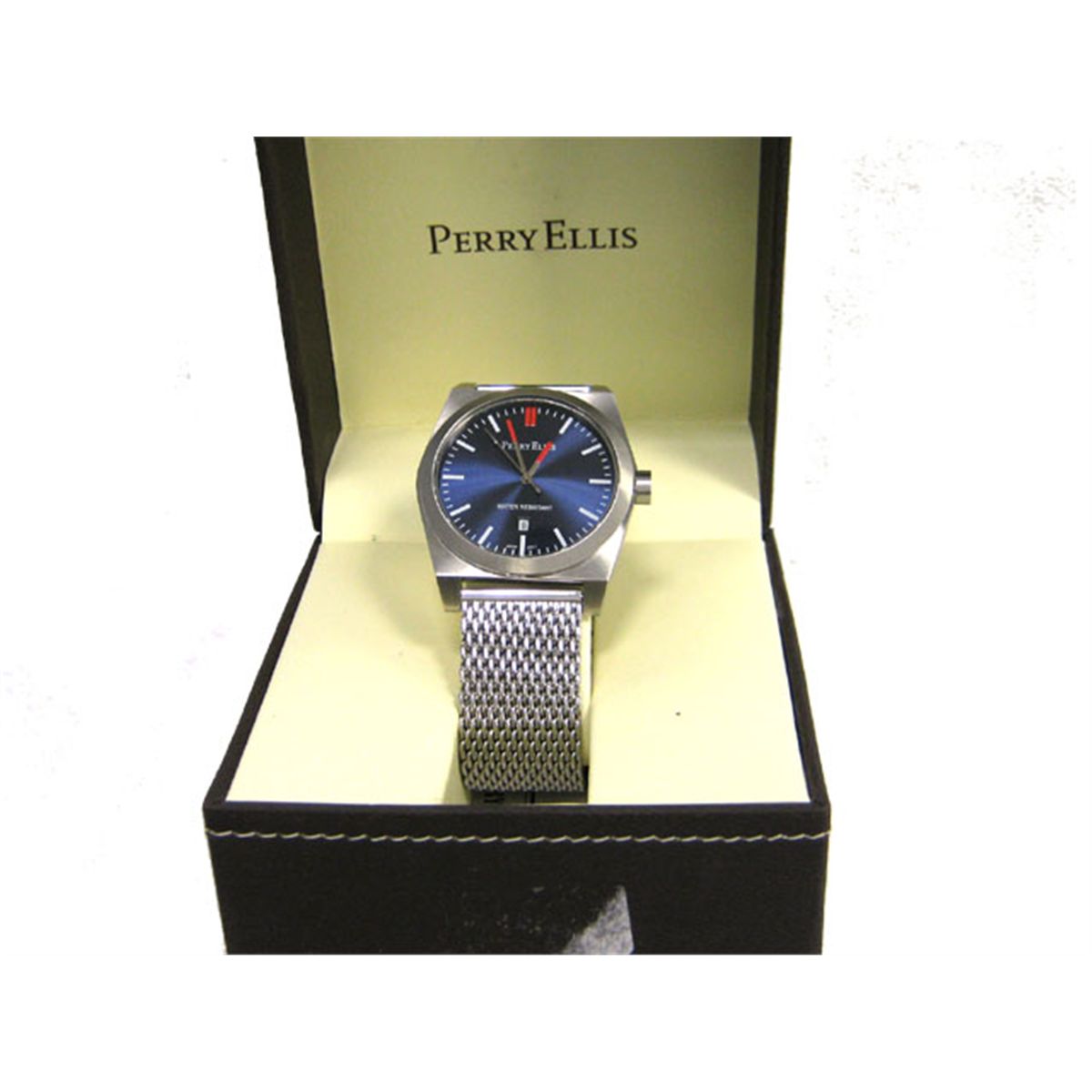This is a Perry Ellis The Danny Watch with the following features: Stainless steel case and mesh band; blue dial with date at 6:00; Mineral crystal; Japanese movement; and Water Resistant