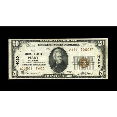 <B>Perry, OK</B></I> - $20 1929 Ty. 2 <B>First NB</B></I> Ch. # 14020<BR>A nice grade example from this tougher 14000 charter bank. <B>Very Fine+.</B></I><BR><BR><b>Shipping:</b> Coin/Currency (<a target="_blank" href="http://www.heritageauctions.com/common/shipping.php">view shipping information</a>)