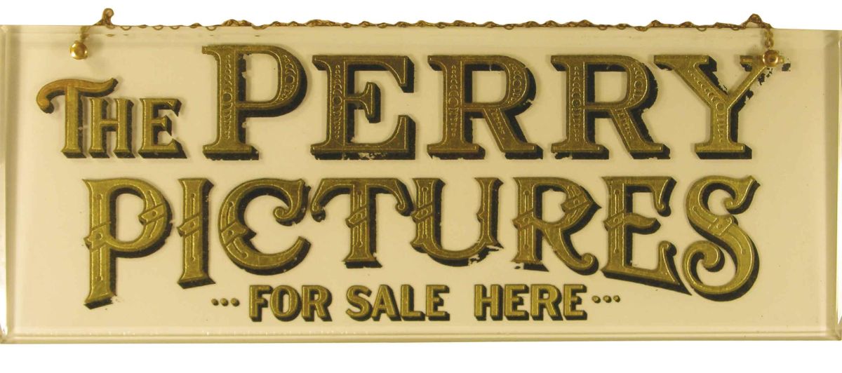 Perry Pictures for sale here, reverse glass chain hanging sign. Some minor loss to paint drop shadows, otherwise very good condition. 16 X 6 inches. Start Price $20