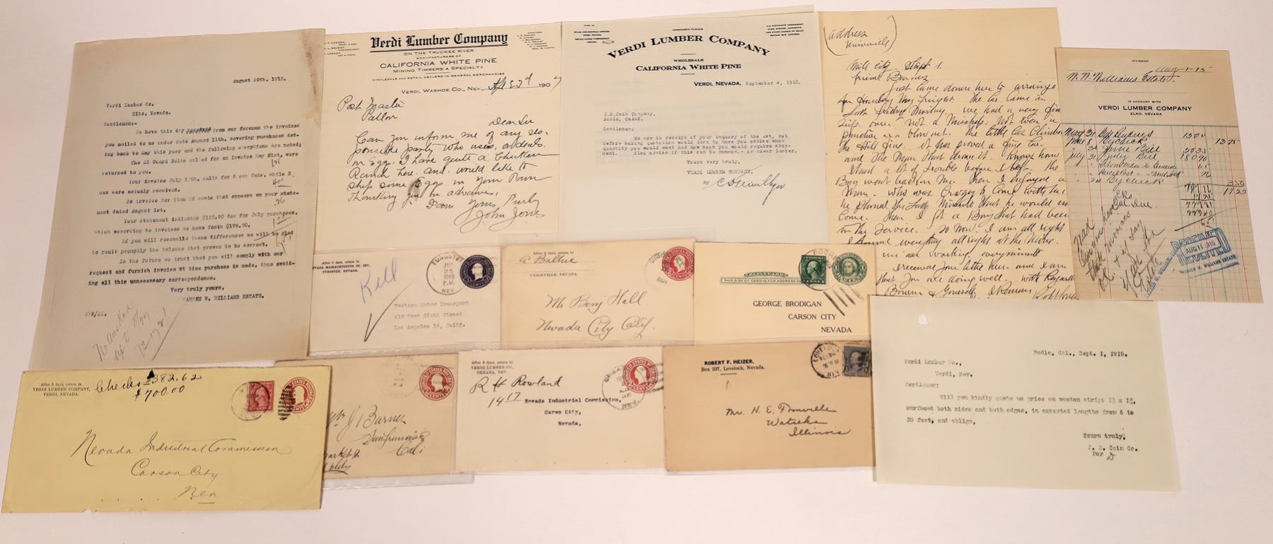 Pershing County was created until 1919. These are all postmarked after the date of creation and truly Pershing County Covers. Lot of six. 1) Rochester. R-4, 1919, as early as it gets. 2) Mill City, 1919. 3) Lovelock, Robert Heizer cc, noted Native American archeologist. 4) Tungsten, 1949, Nevada Massachusetts Mining cc. 5) Oreana,1921 Verdi Lumber Company, Oreana cc, Rare. Includes four different billheads. Letter and billhead regarding J. S. Cain of Bodie. 6) Unionville, 1924 with letter about driving there. City:Pershing County Group State:Nevada Date: