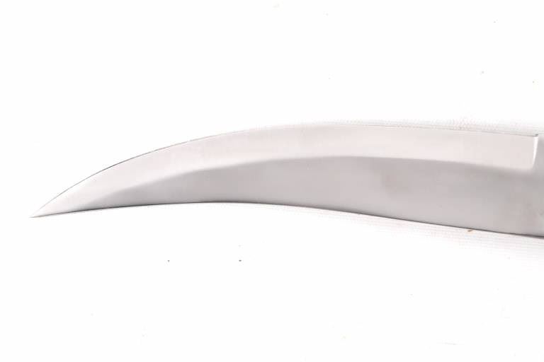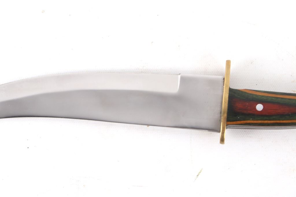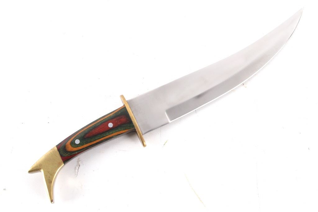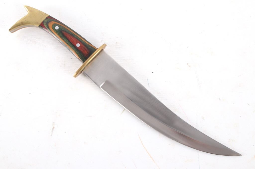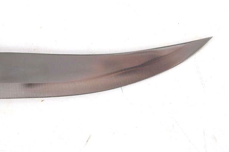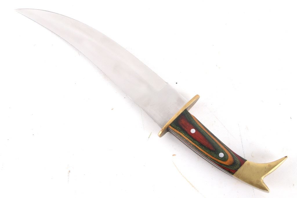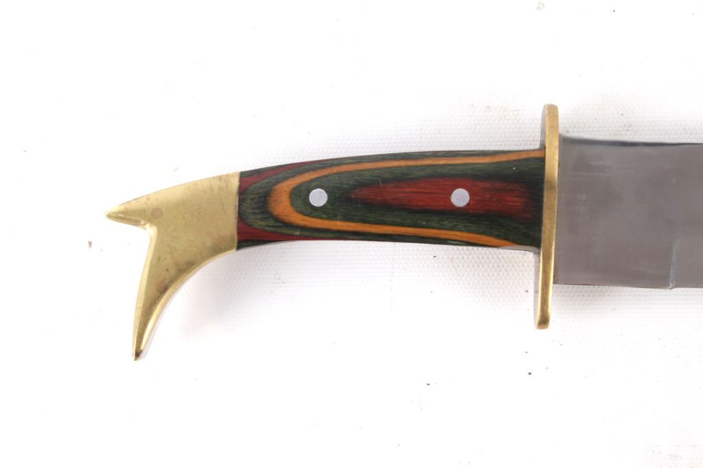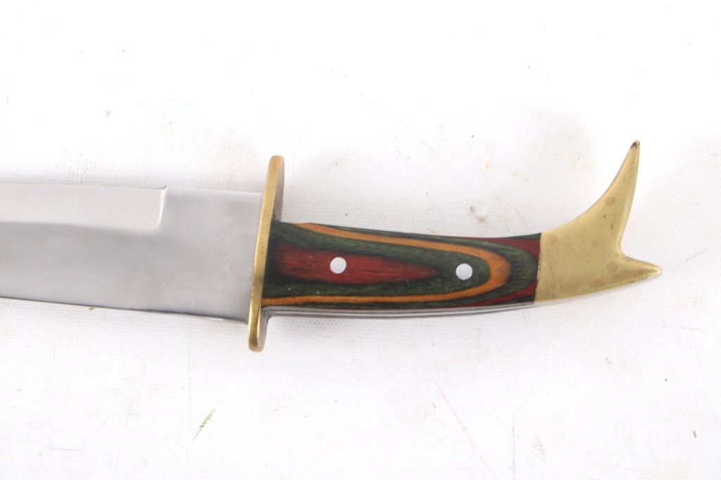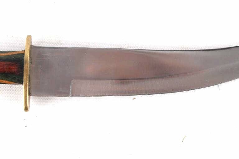 Featured in this lot is this Persian curvate bladed knife with boot cut hilt and custom sheath, circa late 1900's. The knife shows a Persian shape curvate blade without marks and shows a full tang with a boot cut brass hilt and a composite multi color handle. The sheath shows black leather construction with an eagle stamped into the face of the sheath. The condition of this knife and sheath is good, with no obvious signs of damage. The measurements of the knife in sheath are 14 1/2" x 2 5/8" x 1 3/4" and the blade length is 9".