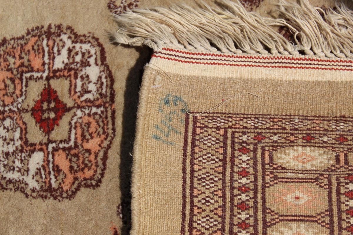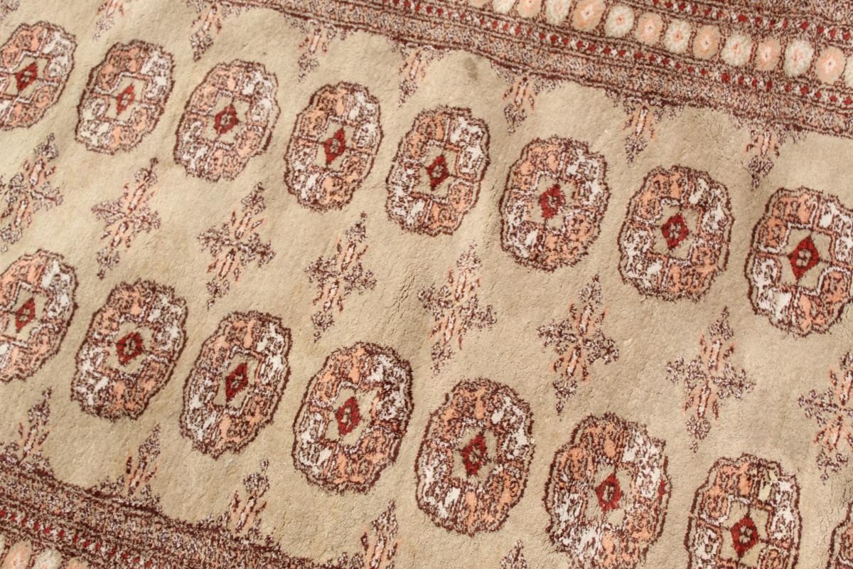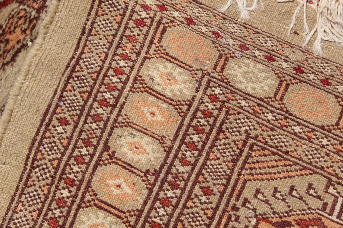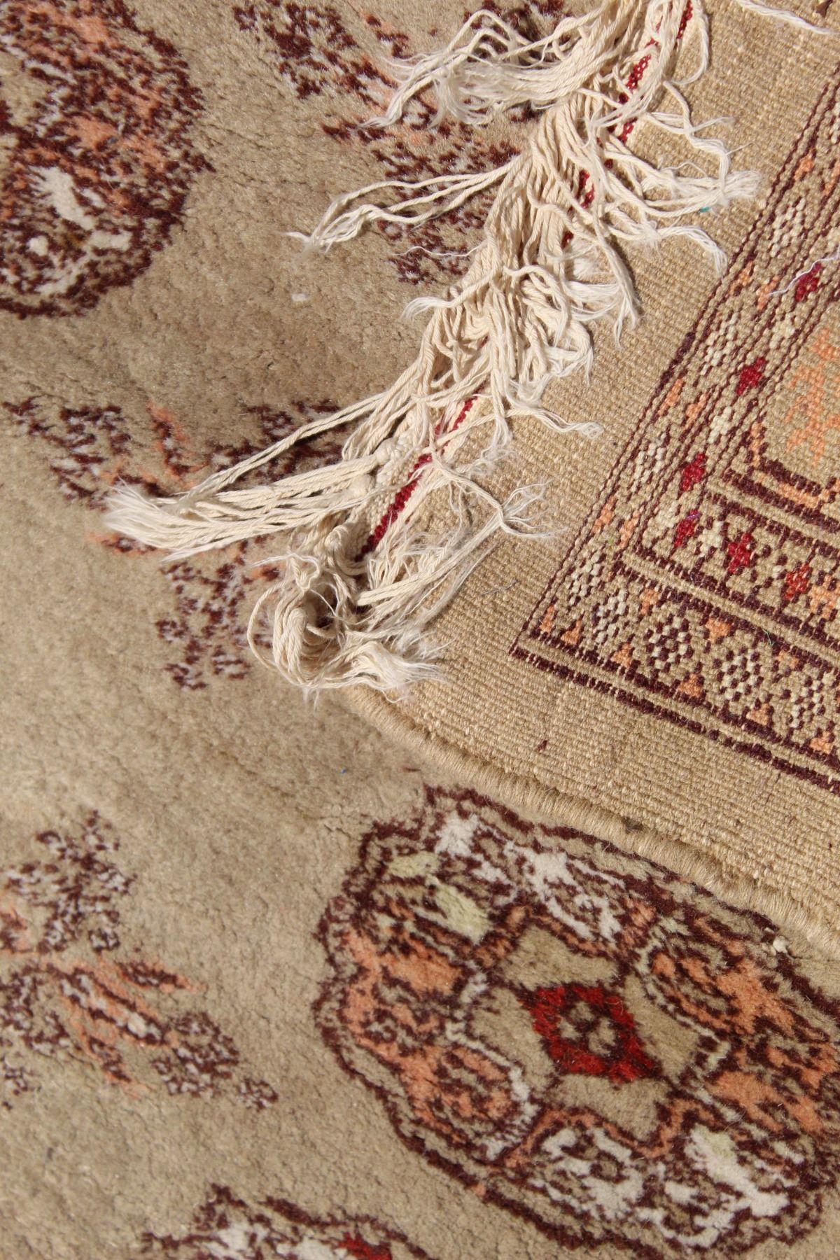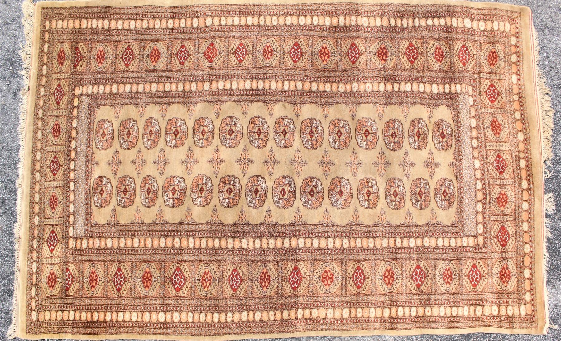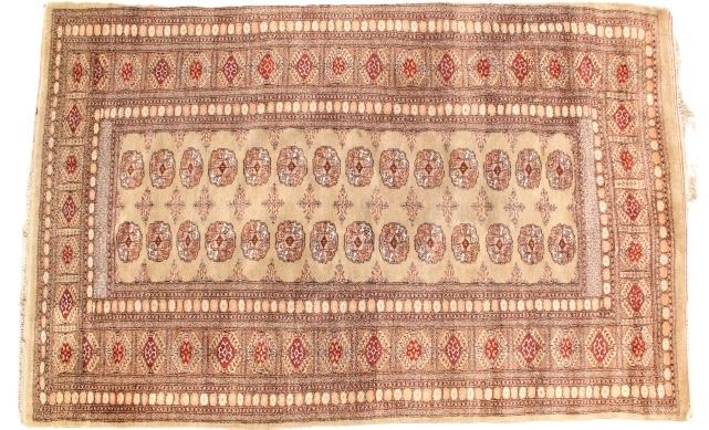 Large Bokhara Area Rug, hand-knotted all wool pile. Beautiful color and geometric design. Every knot of the rug is honed by a skilled weaver's hands, without any machine's interference. The quality of a hand-knotted carpet is determined by the number of knots per square inch. Some loss of fringe and staining, commensurate with age and use.