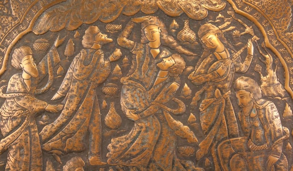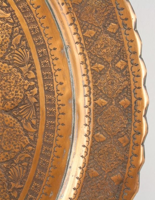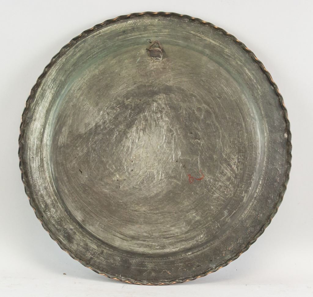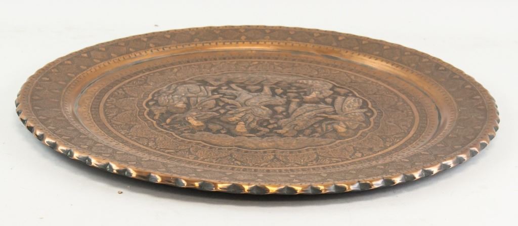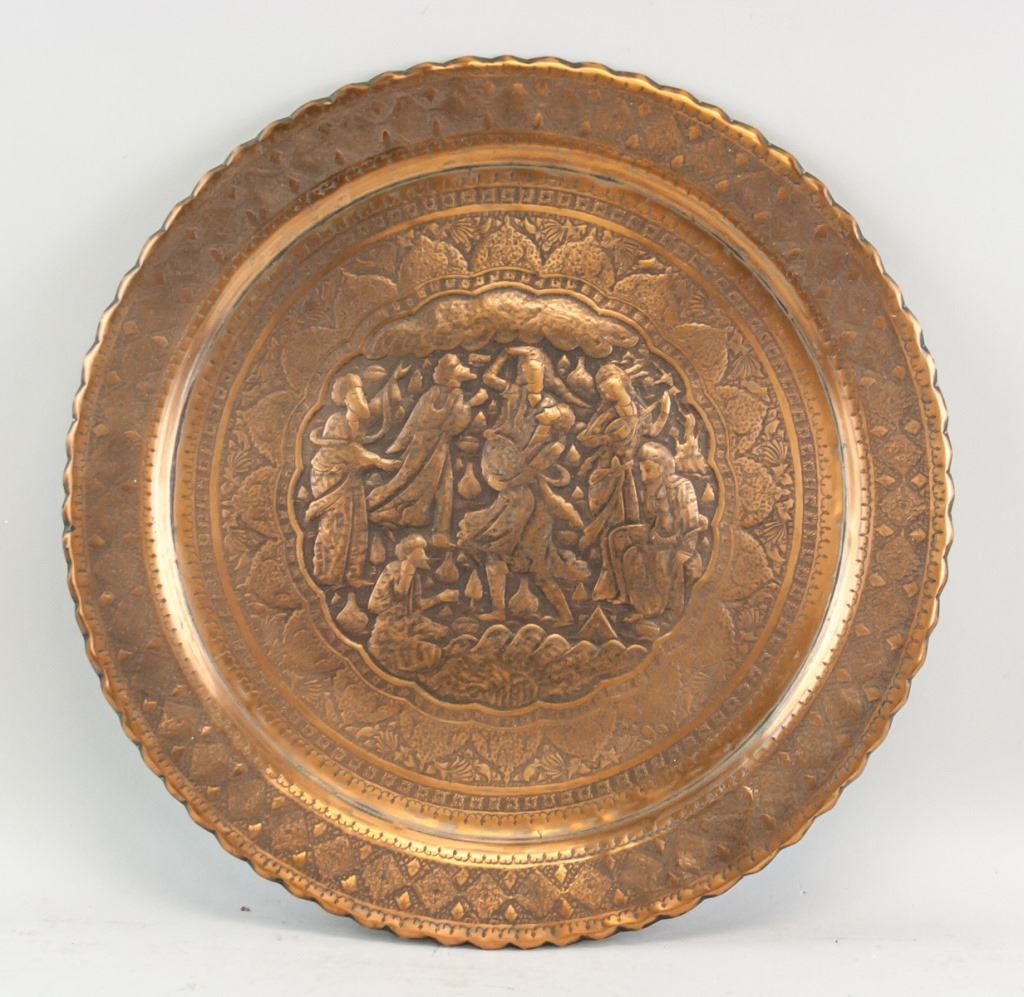 Persian bronze and copper tray. Of circular form. Decorated with figures and patterns. 1 x 43 cm, 1600 grams.