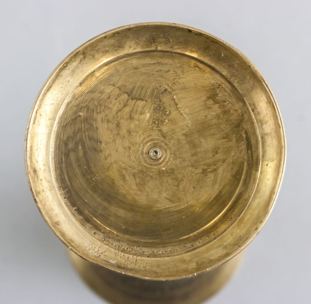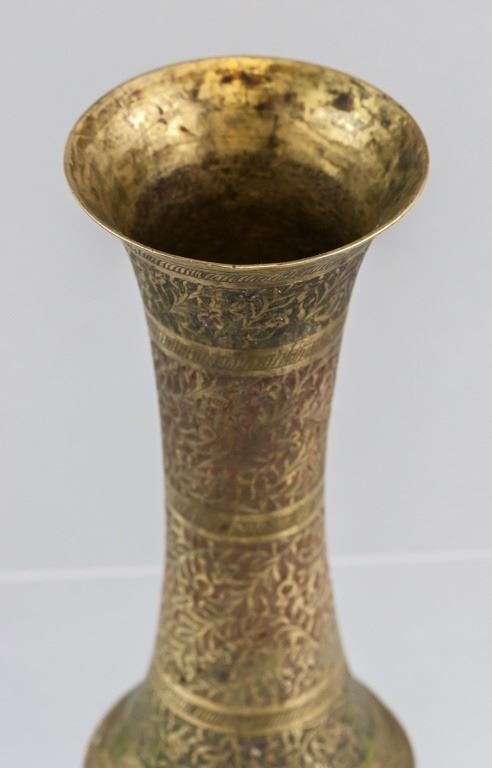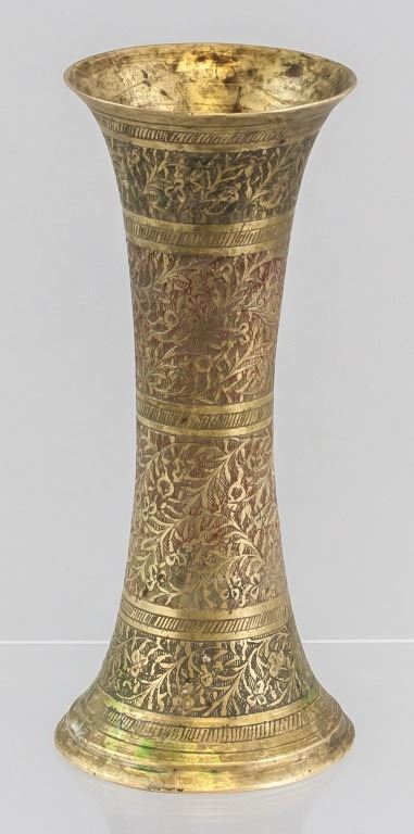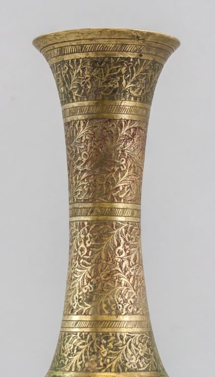 Persian bronze vase. With delicate detailing of leaves. Of tall narrow shape, with flared top and base. 16 x 7 cm. 180 grams.