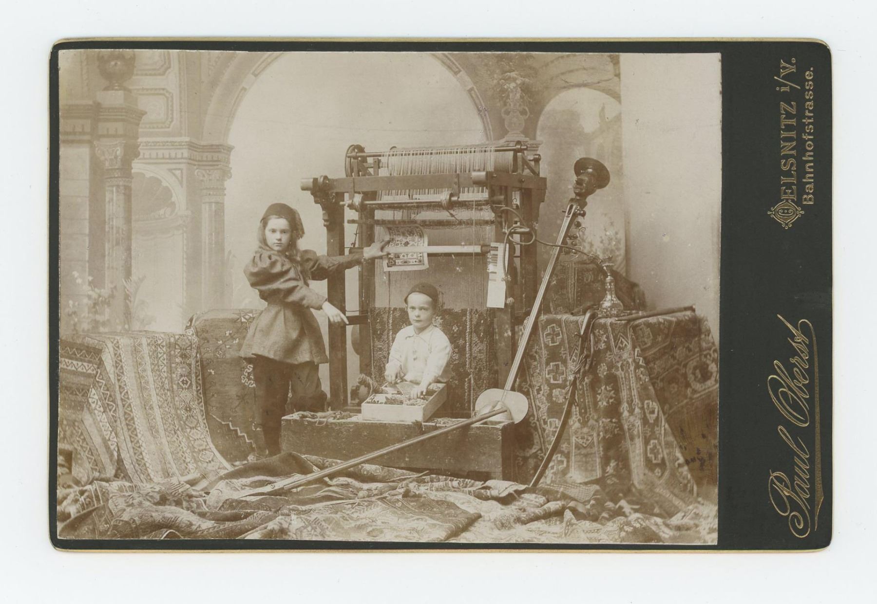 Interesting image of Children alongside a weaving loom, surrounded by Persian Rugs. Taken by Paul Oberst in Oelsnitz, Germany.