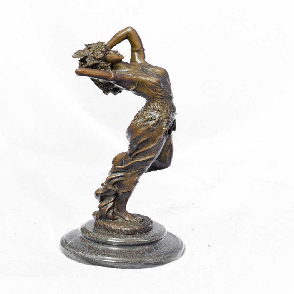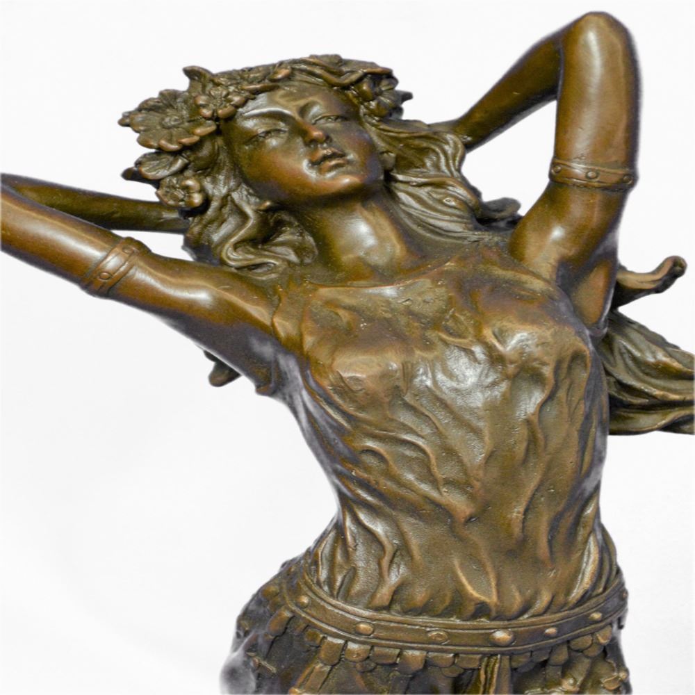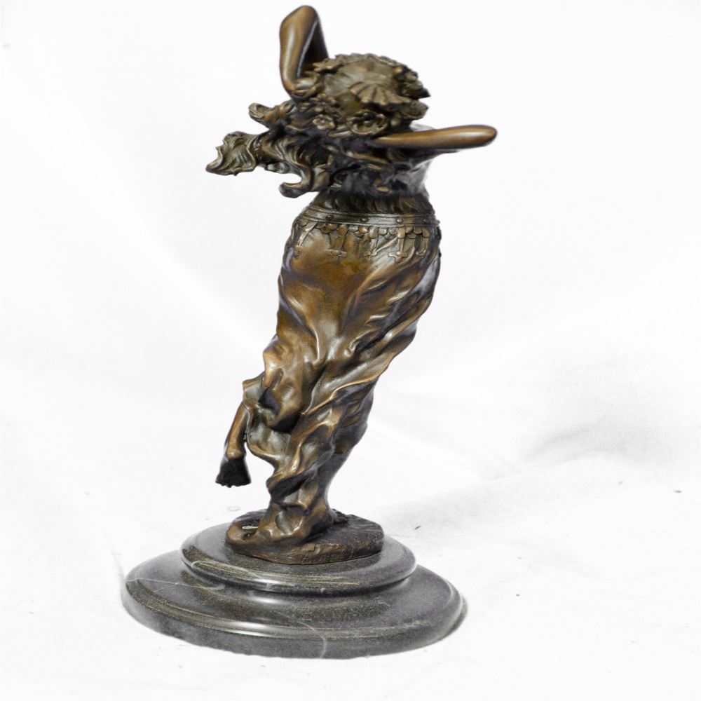 This lovely original Sculpture of a Persian woman Standing gracefully and dancing. She is really concentrated in the music instrument playing in radio, she carefully listening to music not to make any mistake. She is aiming for that standing ovation. Her dress touches the floor cause of how long it is she has this beautiful hat that has amazing details to it. 100% Bronze handmade and fully detailed, this brown patina Sculpture was cast using the Lost Wax Method and it is mounted on a marble base. Bronze Dimensions with Marble Base: Height 14 X Width 5 inches. Weight: 8 LBS.