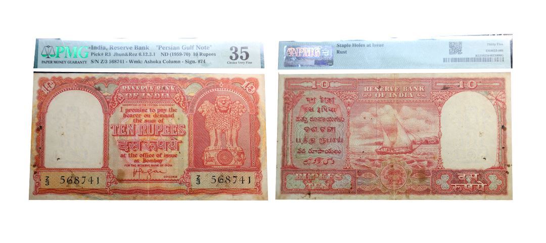 Persian Gulf Issue, 10 rupees, ND (1959), signed by H.V.R. Iengar, inset 'A', serial no.: Z3 568741, J&R 6.12.3.1. Graded as VF35 by PMG, Rust, Rare.