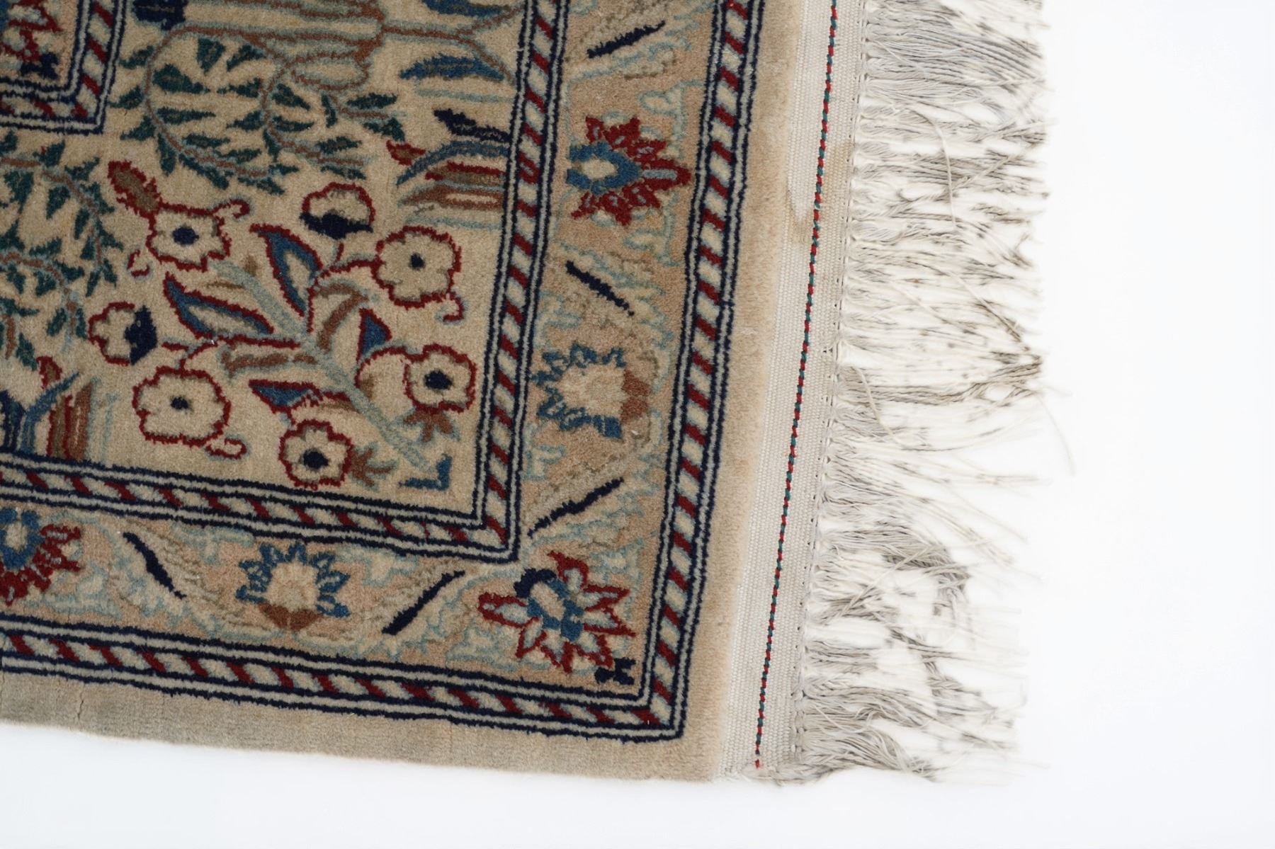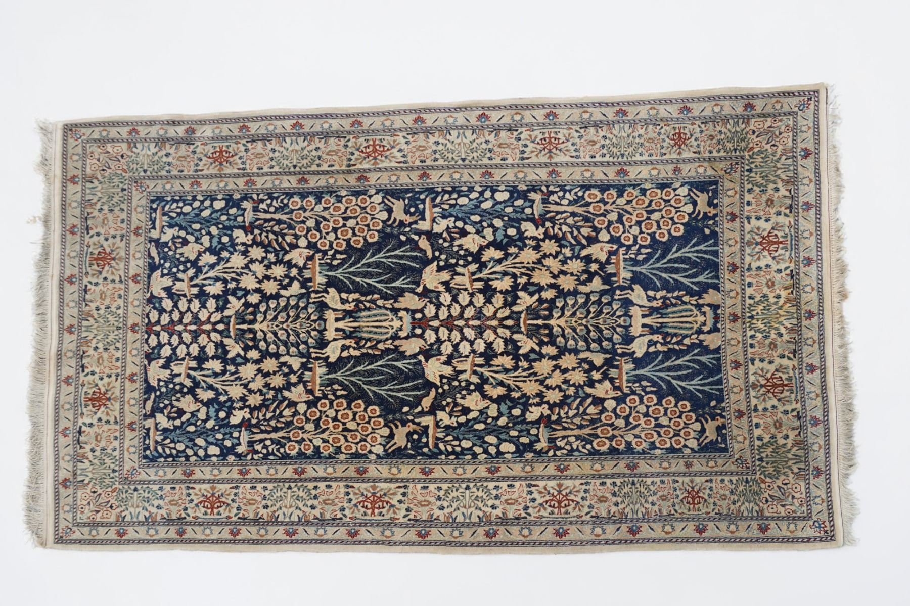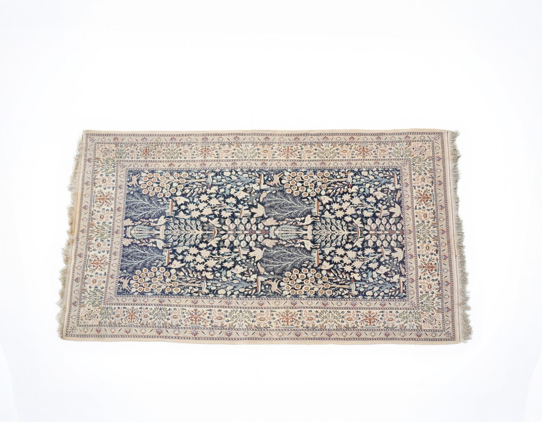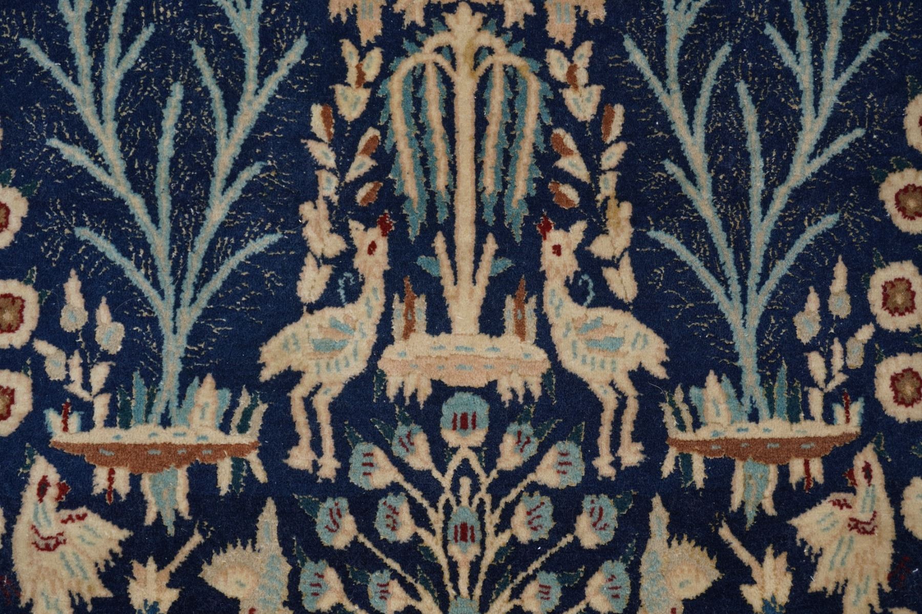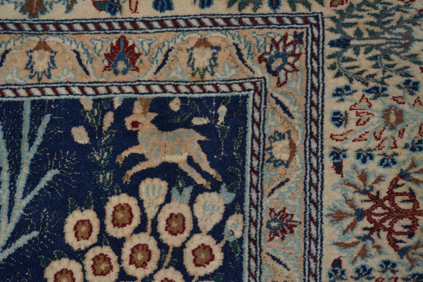A superb hand-knotted Nain Persian wool rug, finely woven in the classic Tree of Life design, featuring graceful birds, deer, and floral sprays within a deep indigo field. The symmetrical composition is intricately rendered in tones of ivory, pale blue, and soft gold, enclosed by a complex series of floral borders with exquisite botanical motifs. The rug exhibits the refined craftsmanship for which Nain weavers are celebrated, with precise drawing, balanced proportions, and a supple handle. Likely wool on cotton foundation, with full fringe and excellent color harmony. A distinguished example of mid-20th-century Nain weaving artistry, symbolizing renewal and serenity through nature's imagery.