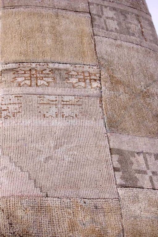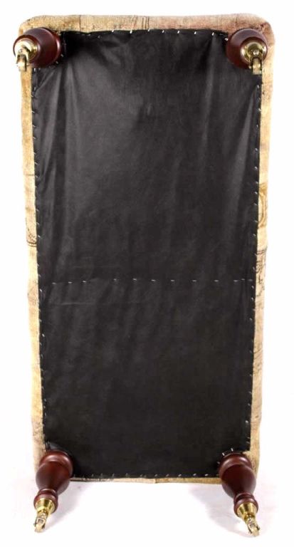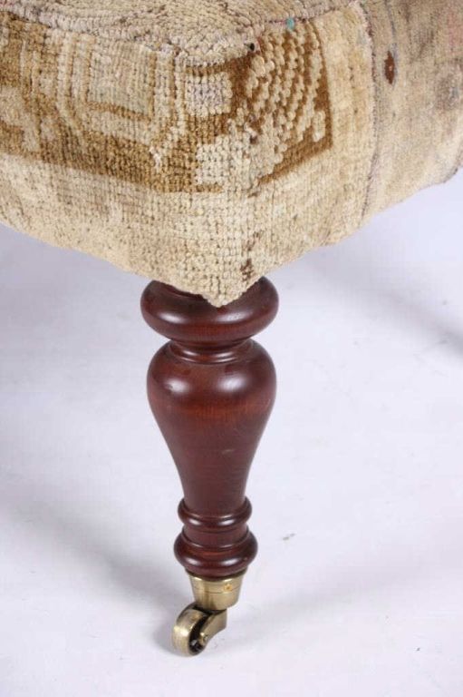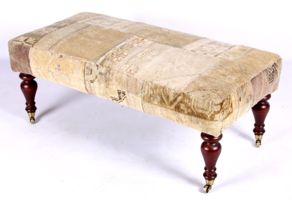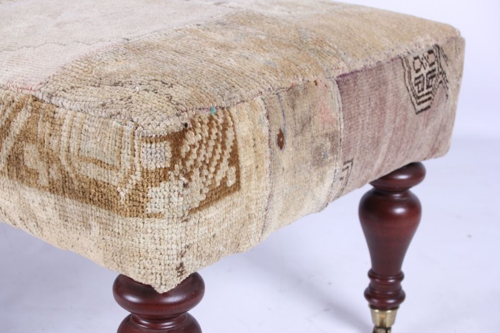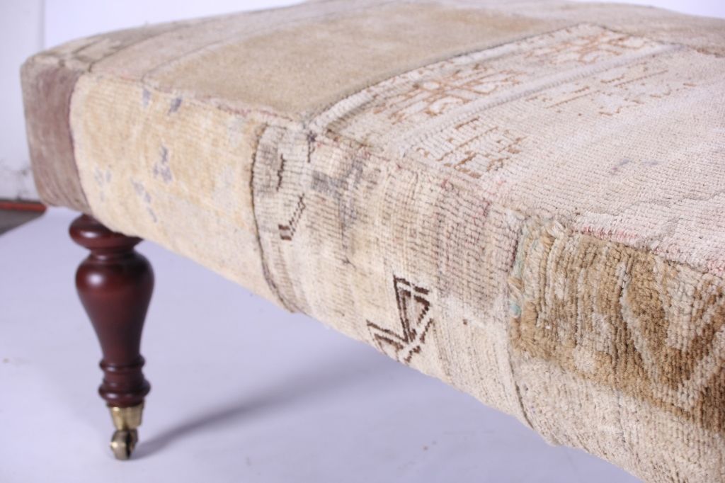 The rug is in great condition with wood legs and brass casters. The Top is a pad covered Kilim Persian Rug patch work. Measures 23"x47" and 19" tall.