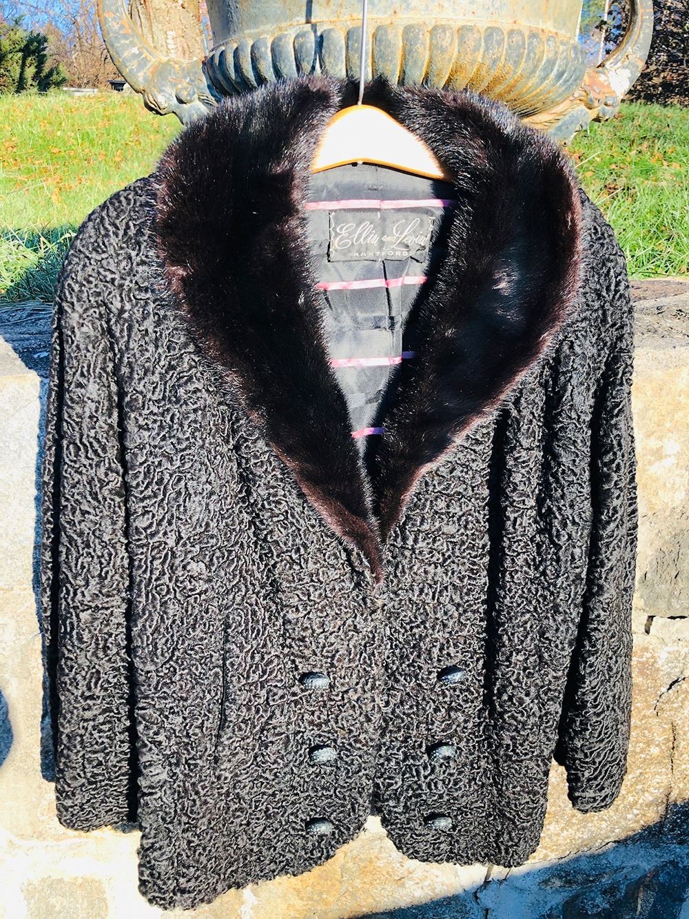 Vintage Persian Lamb coat with mink fur collar, made by Ellin and Levin, Hartford, CT.