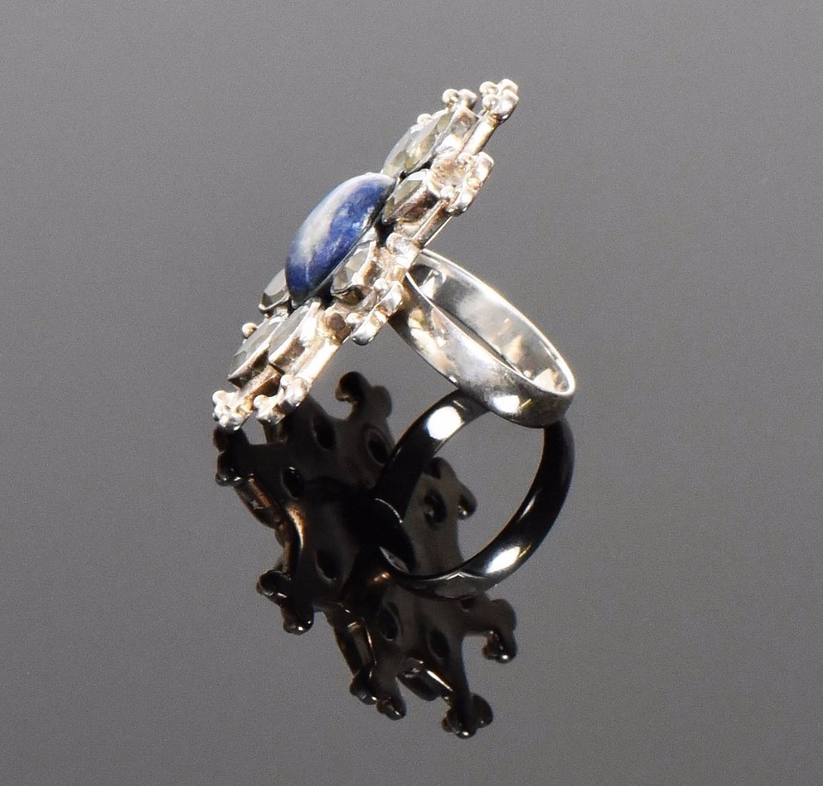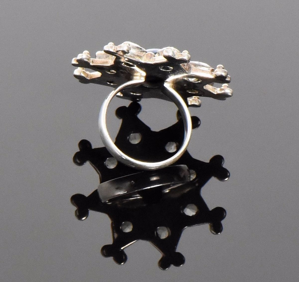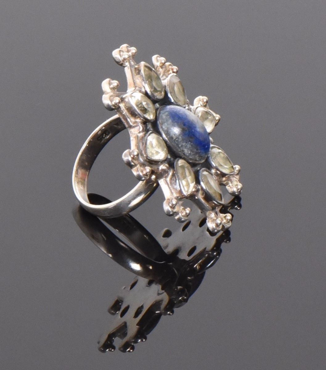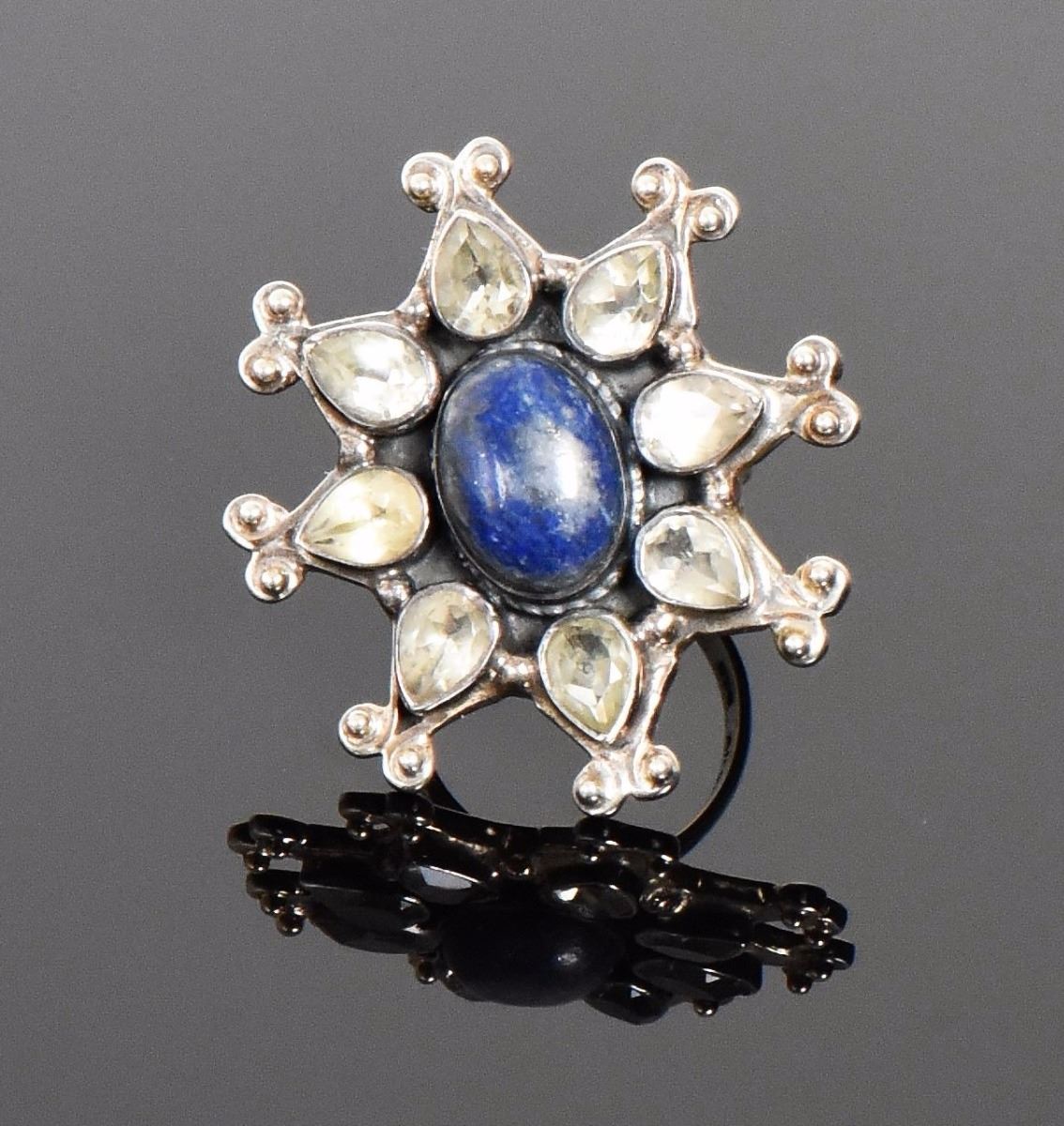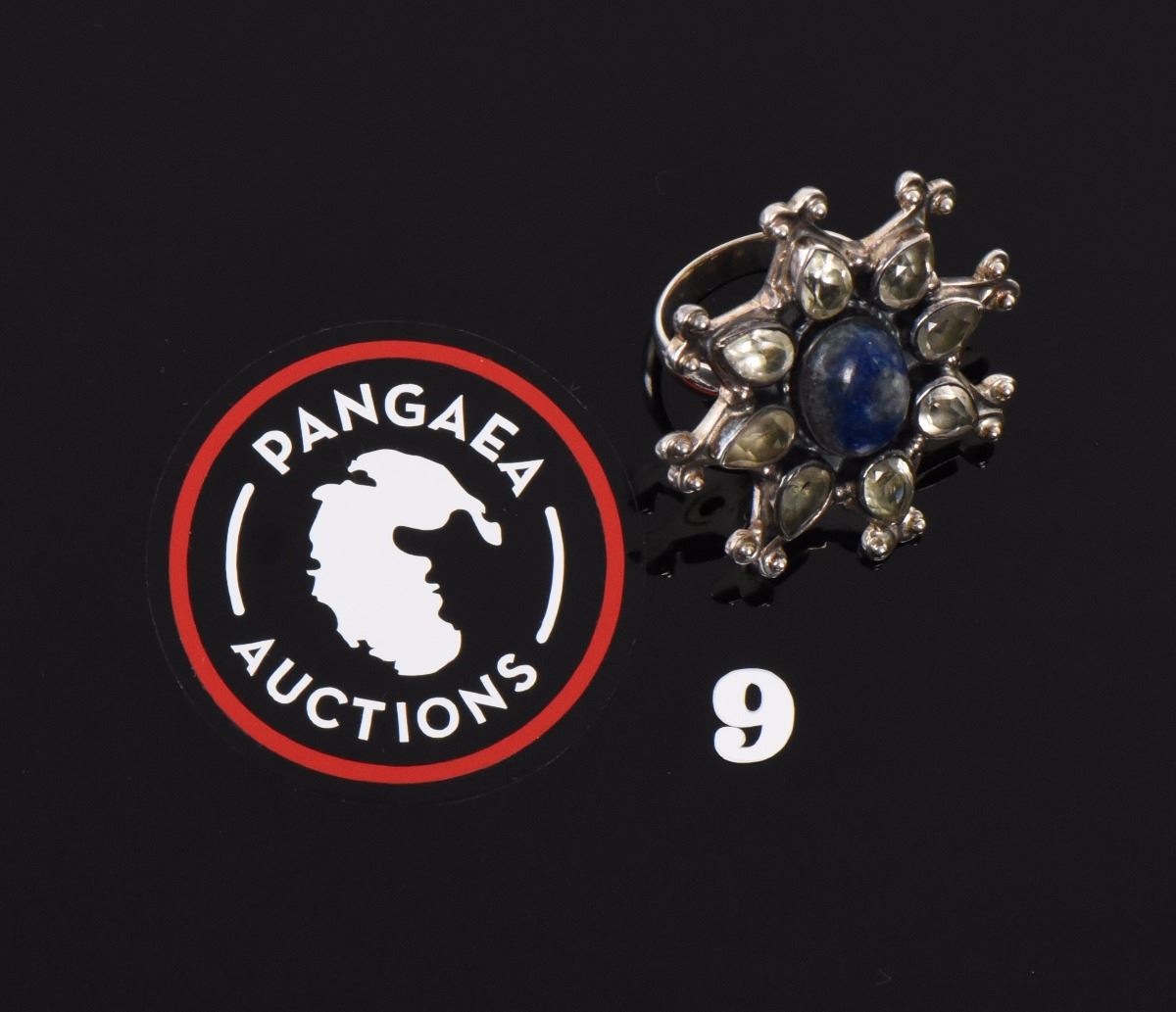 Persian Lapis Lazuli Starburst Ring With White Crystal Stones. Ring Size: 9 Estimated more than 50 yrs old. Silver approximately consisting of 90% silver content. Tested Positive: Nitric Acid Chemical Scratch Test, Cloth Rub Test, Smell Test, Magnet Test. Markings: None. The reason silver needs to be combined with other metals is that it is very difficult to make great designs with just pure silver, which is very soft and malleable. A bit of hardness has to be introduced, by adding other metals such as copper. Mexico is the leading producer of silver, followed by the United States, Canada, Australia, Spain, Peru, and Russia. Silver can be found in nature in silver ore, silver ore is a mixture of other metals including silver. Many countries do not require that precious metal items be stamped. Size: See Ruler Photo. (Photos Represent The Condition Of The Lot.)