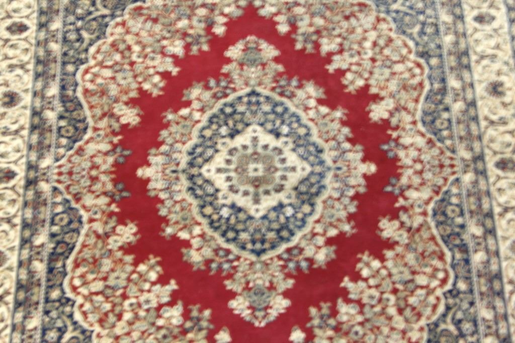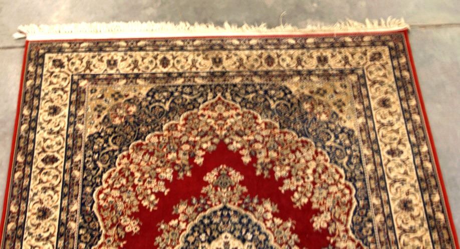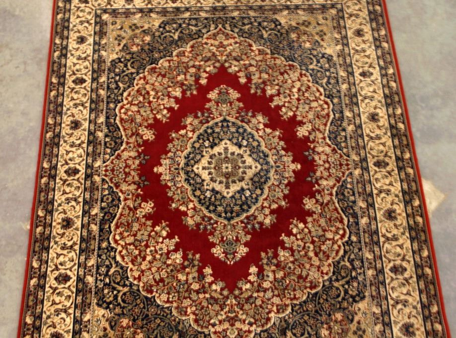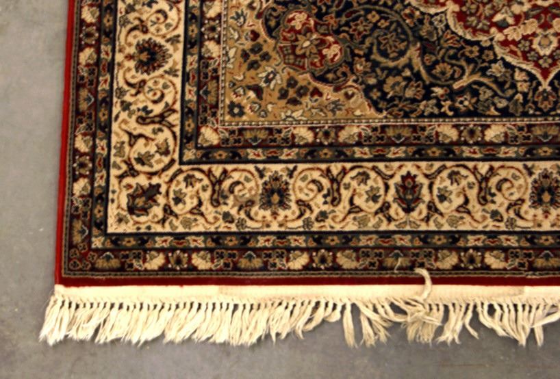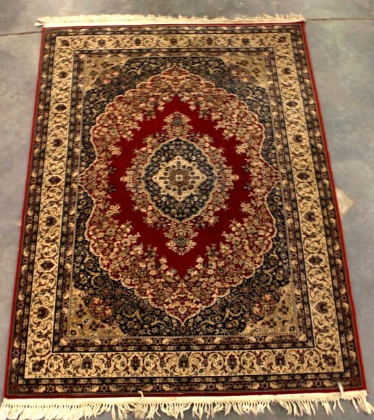 This lot features a large Persian Medallion or Kashan rug. The rug has a stunning floral design built around a central medallion. This type of rug started in Iran and Pakistan. The rug is in good condition for its age, and still has vibrant color. Measures: 5' W x 8' L